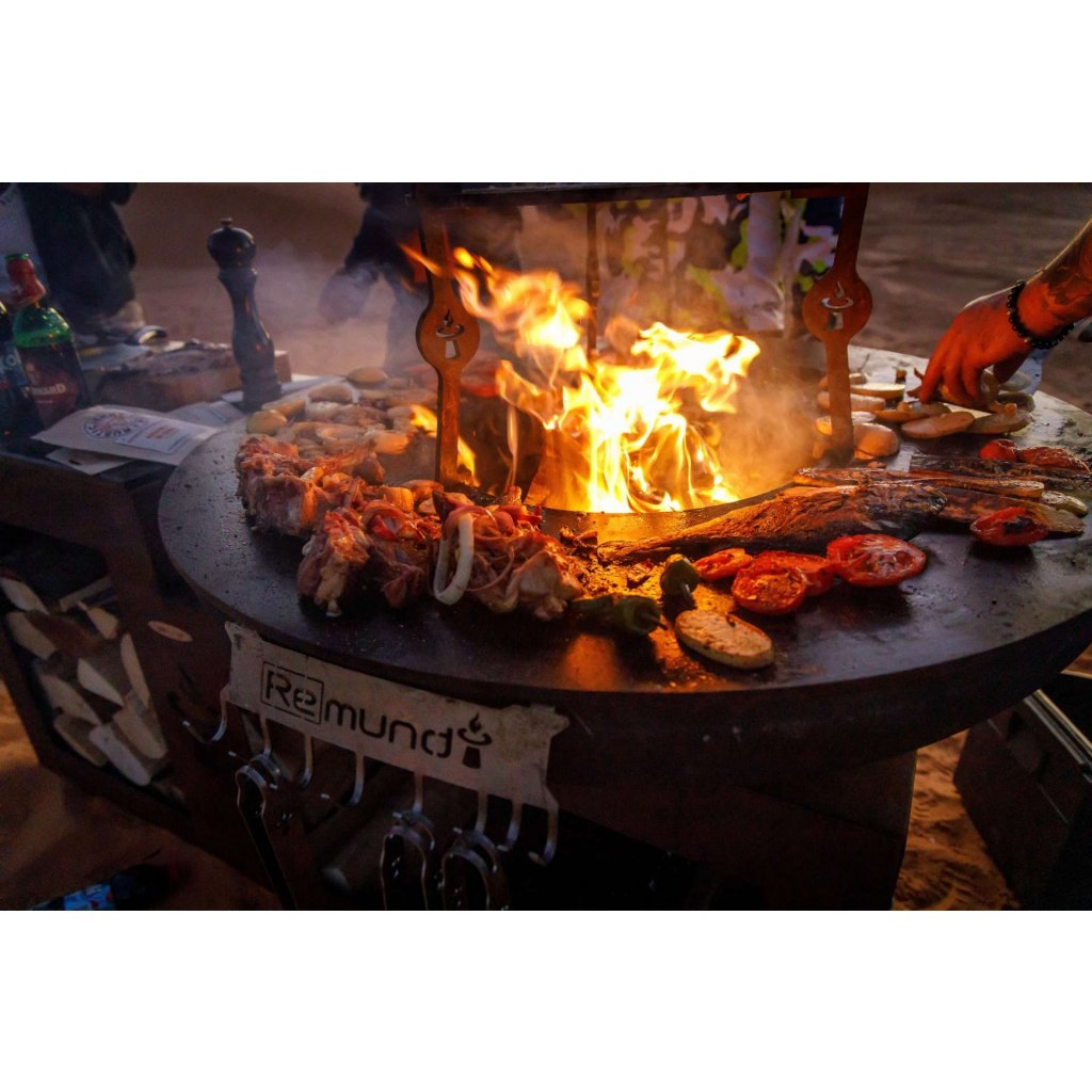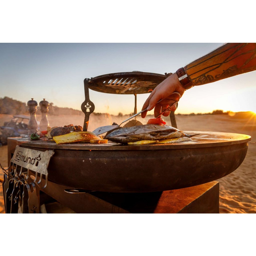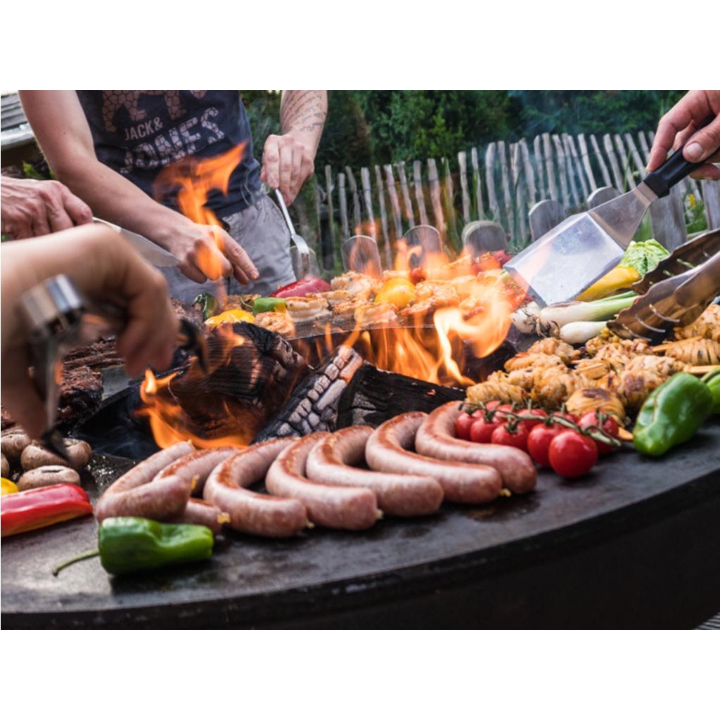 Placa largă cu geometrie specială se încălzește până la 300°C. Cu diferite zone de temperatură, vă permite, de asemenea, să preparați mai multe feluri de mâncare la diferite temperaturi de grătar în același timp. Puteți folosi atât cărbune cât și lemne în grătar și vă puteți bucura de grătar sau de focuri deschise pe tot parcursul anului.