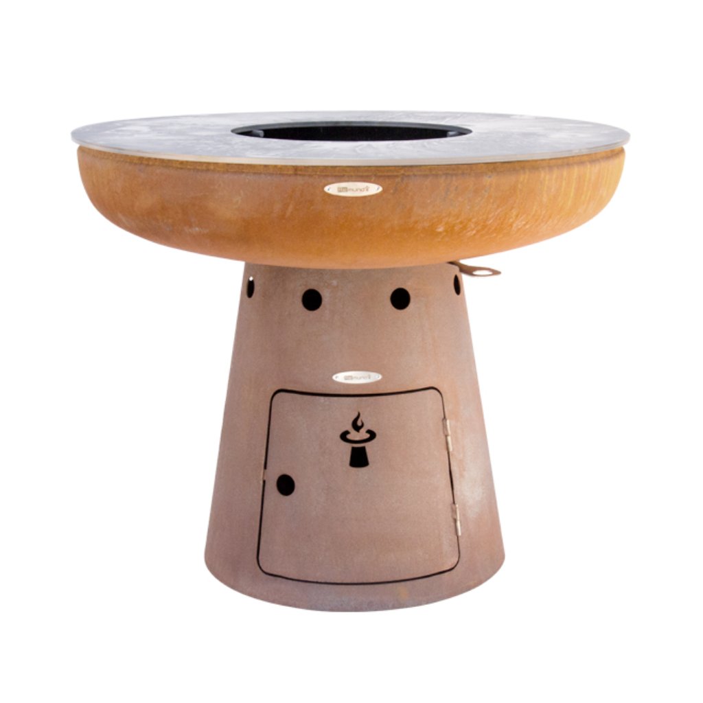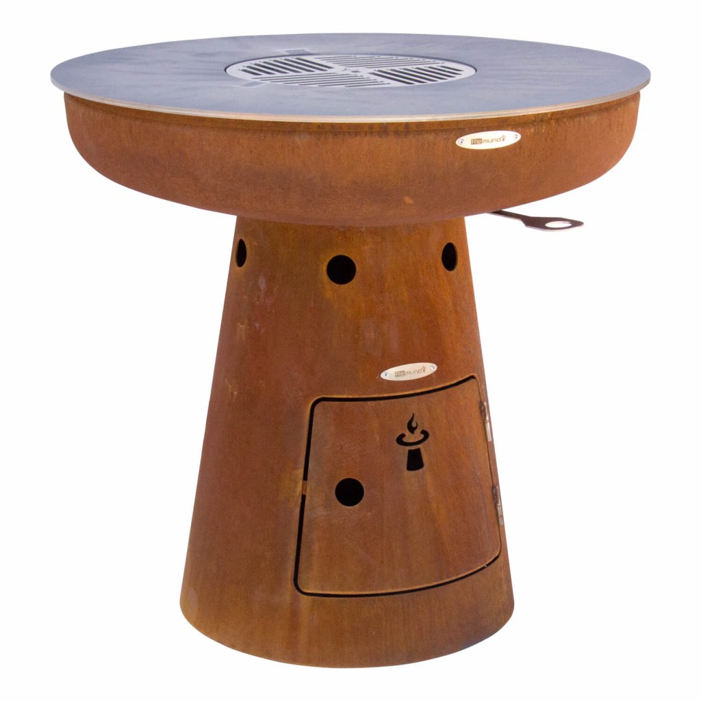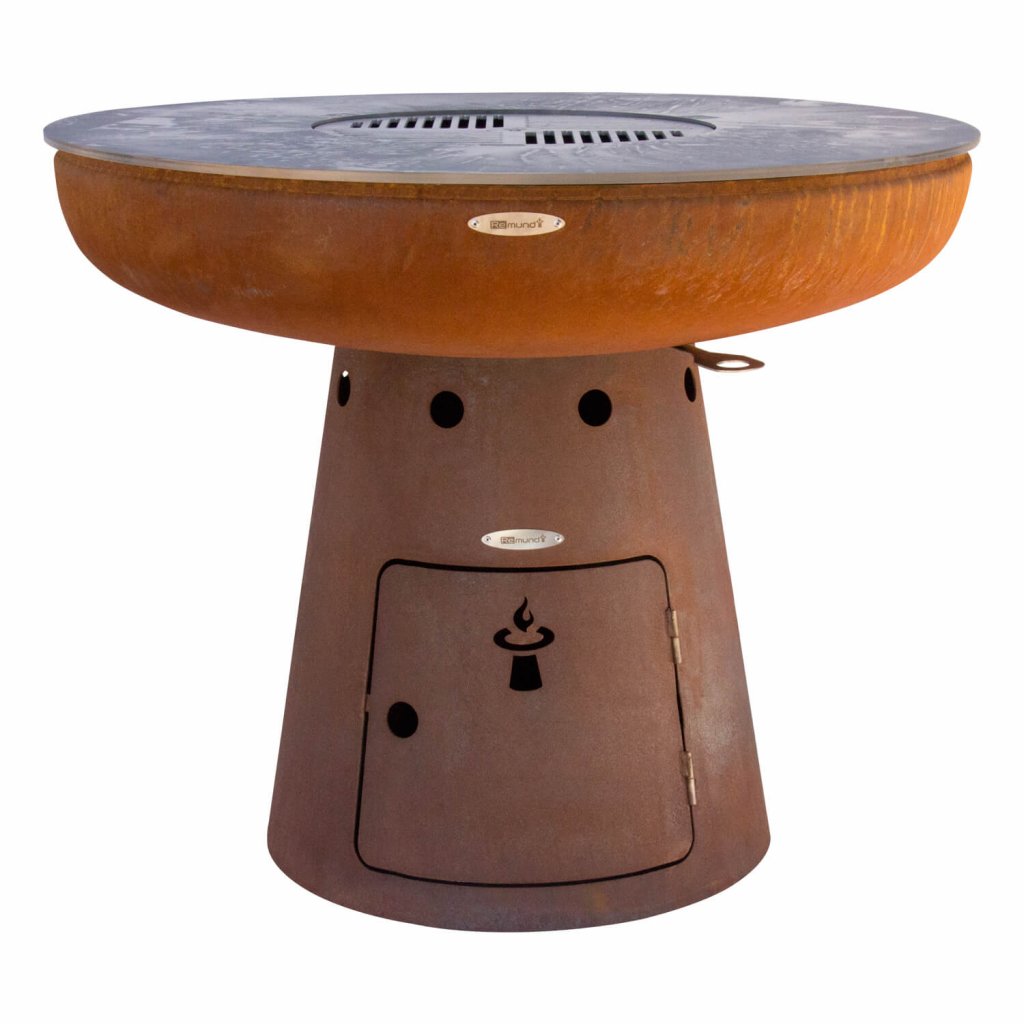 Placa largă cu geometrie specială se încălzește până la 300°C. Cu diferite zone de temperatură, vă permite, de asemenea, să preparați mai multe feluri de mâncare la diferite temperaturi de grătar în același timp. Puteți folosi atât cărbune cât și lemne în grătar și vă puteți bucura de grătar sau de focuri deschise pe tot parcursul anului.