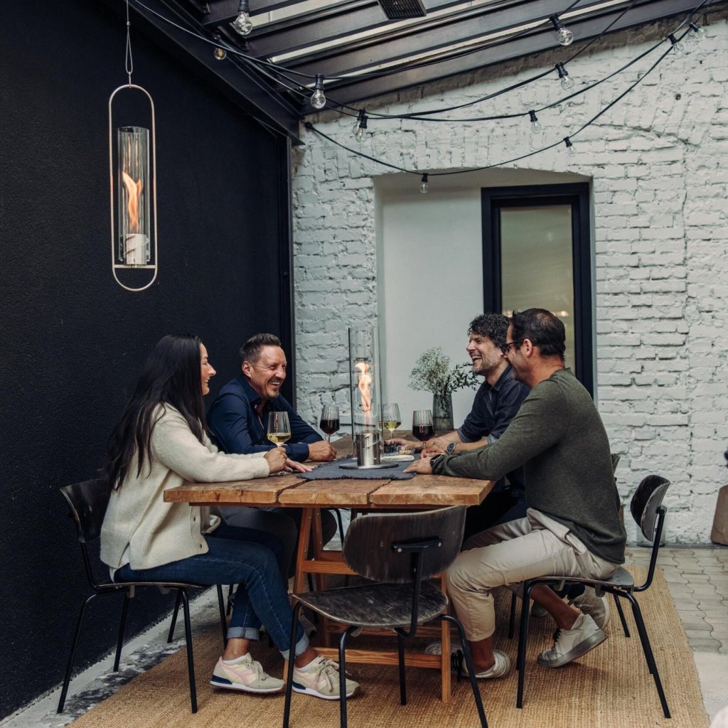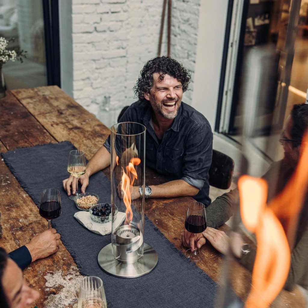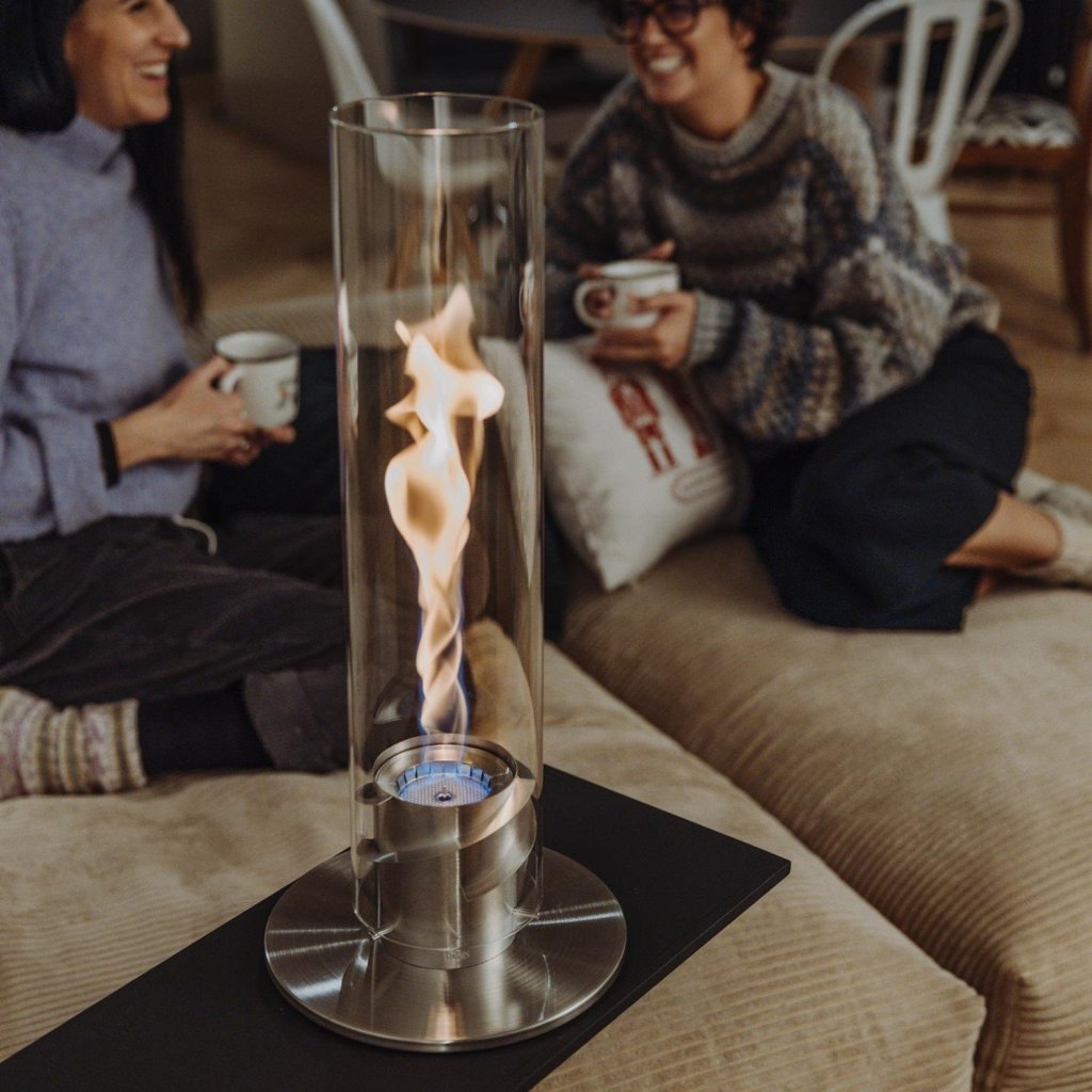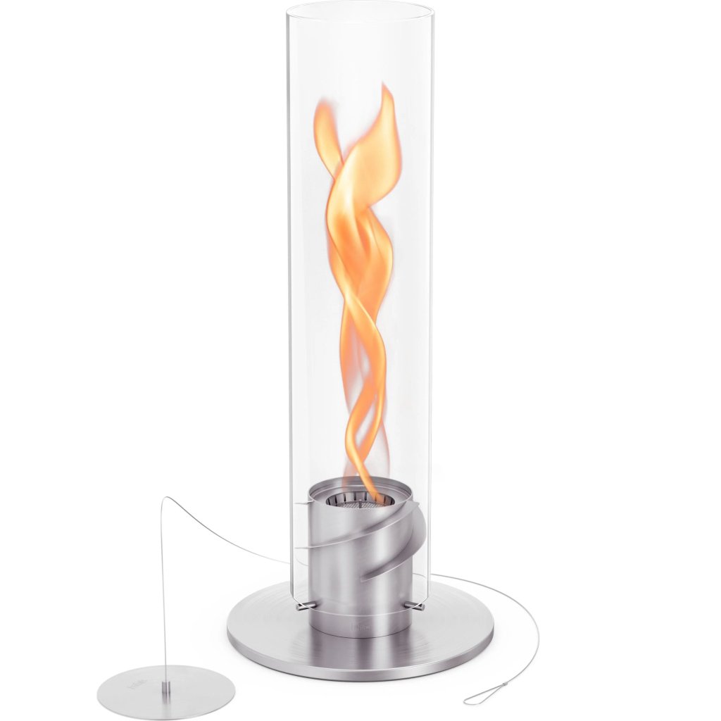 - cilindrul sticlă protejează flacăra de vânt și servește, de asemenea, ca o barieră de siguranță, făcând șemineul sigur de utilizat chiar și în prezența copiilor sau a animalelor de companie
