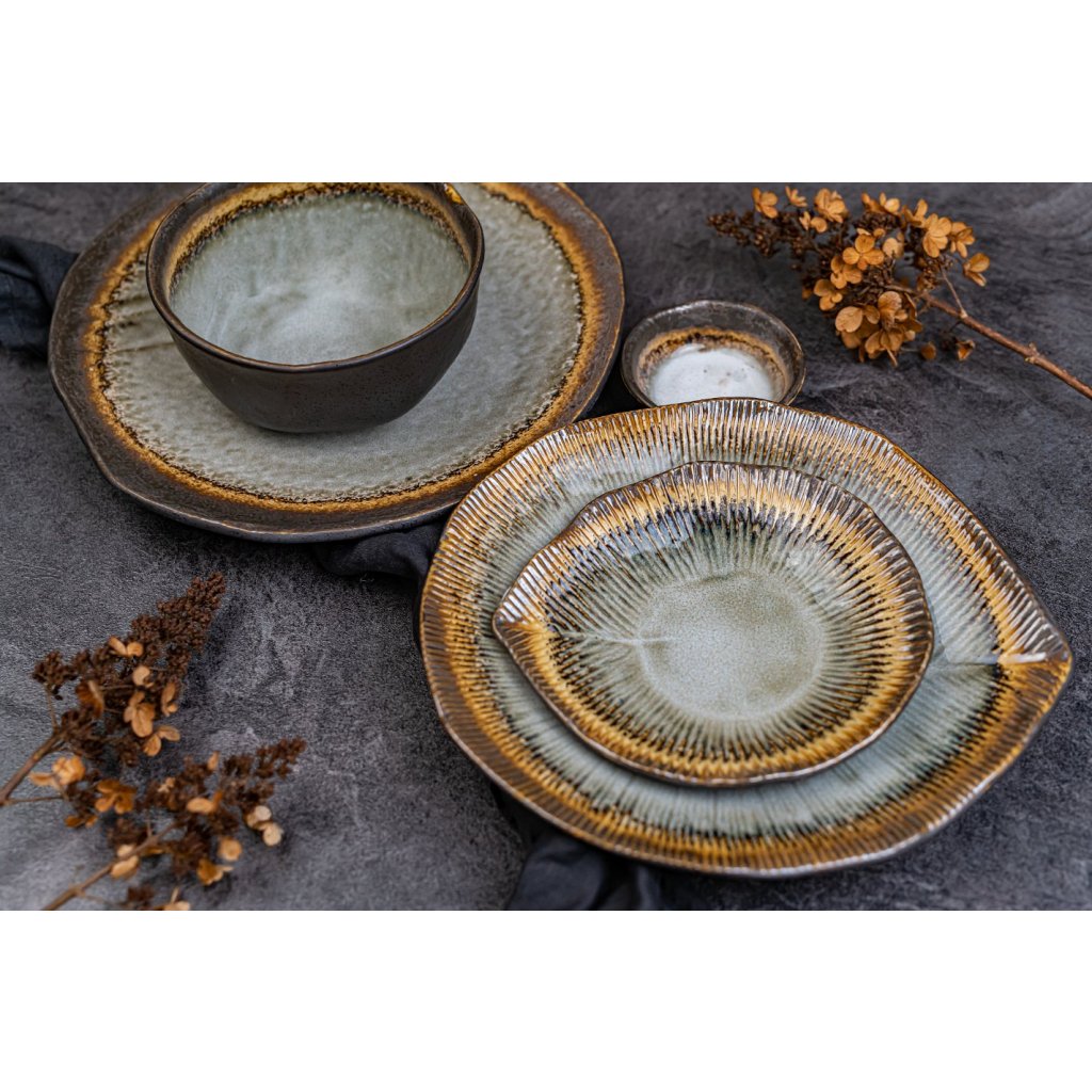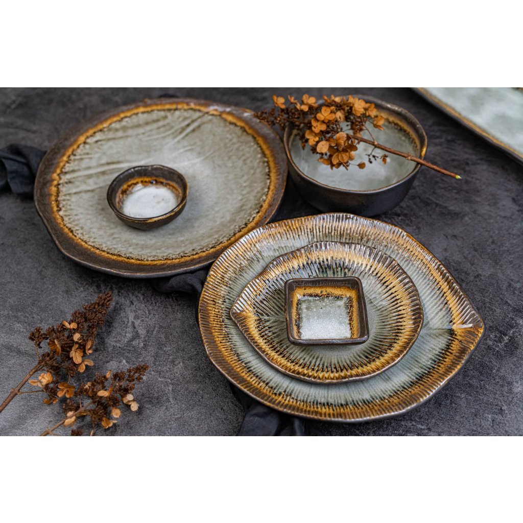 În acest pachet veți găsi o farfurie pentru sos foarte interesantă cu margine neregulată din colecția Akane Grey, cu un diametru de 8 cm. Bolul lucios are culoarea gri, linii galbene și margini maro.
