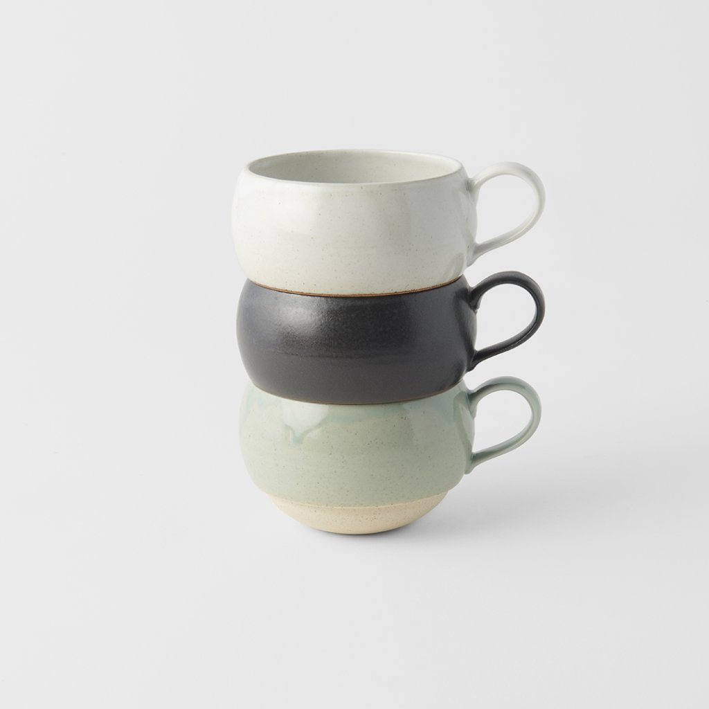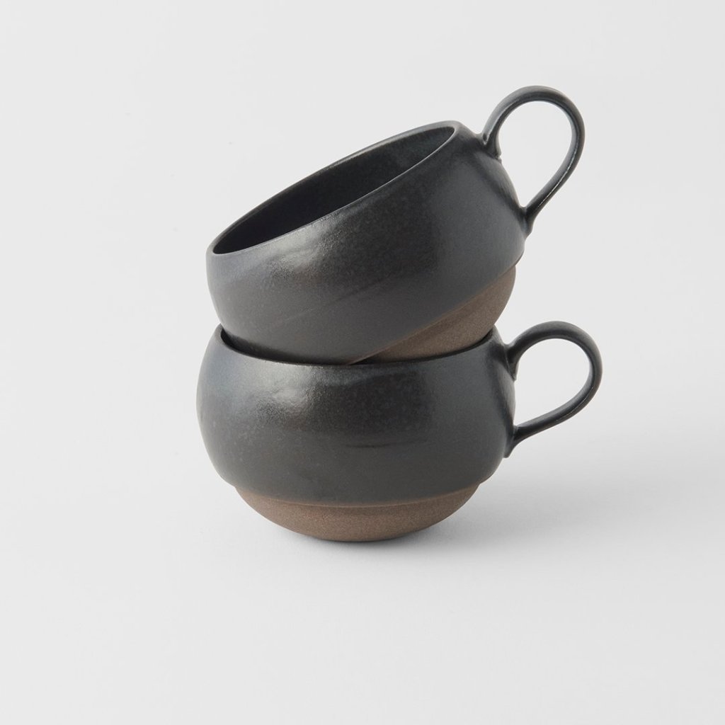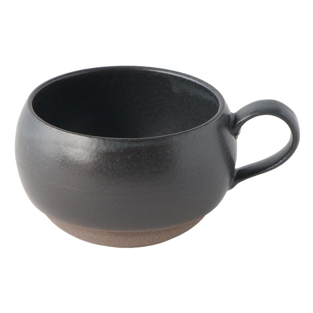 - cană rotund negru lat cu mâner pentru diverse băuturi calde și reci