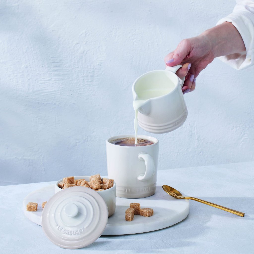 - Nuanța Cană Le Creuset în nuanța MERINGUE întruchipează puritatea, moliciunea și eleganța atemporală - nuanța sa cremoasă alb , cu o ușoară atingere caldă, conferă oricărui decor un aspect elegant, dar natural.