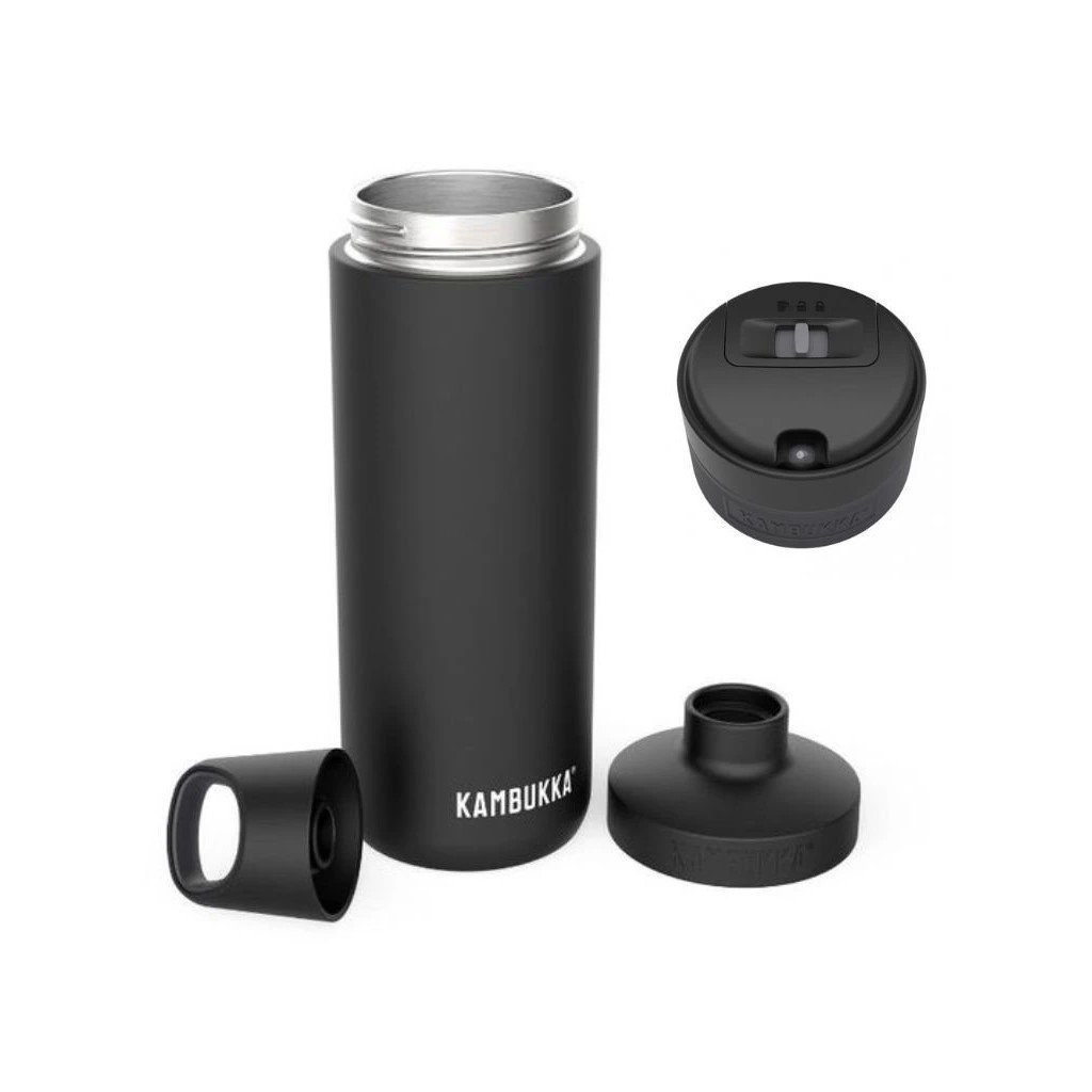 - Pachetul cadou Kambukka conține un recipient de designer cană termos ETNA cu un volum de 500 ml și două capace - capac 3 în 1 ETNA și capac cu filet RENO în negru