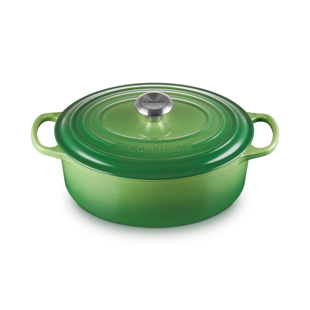 - Tava ovală fontă capac pentru caserolă Le Creuset în culoarea BAMBOO este un ajutor universal în bucătărie, suficient de spațioasă pentru a coace o pulpă întreagă de miel și, în același timp, suficient de îngustă pentru a lăsa loc în cuptor pentru garnituri.