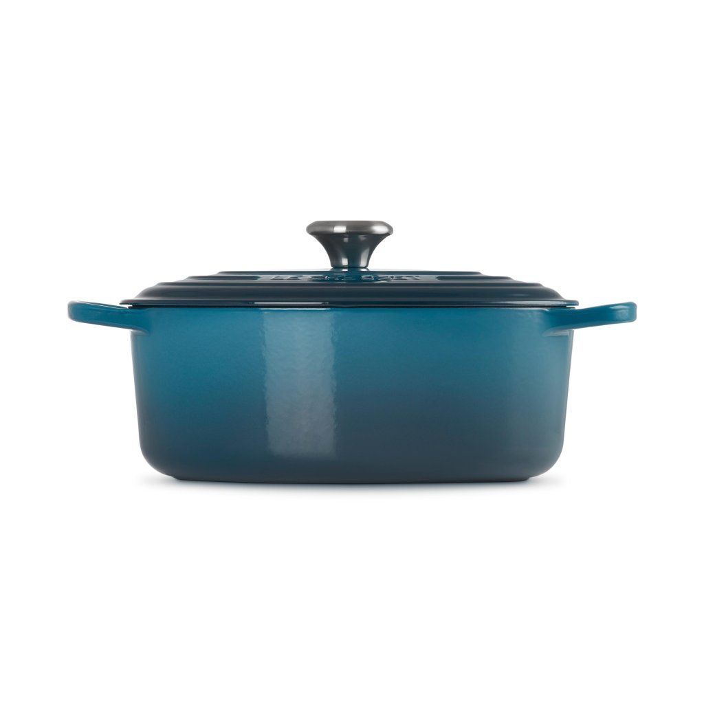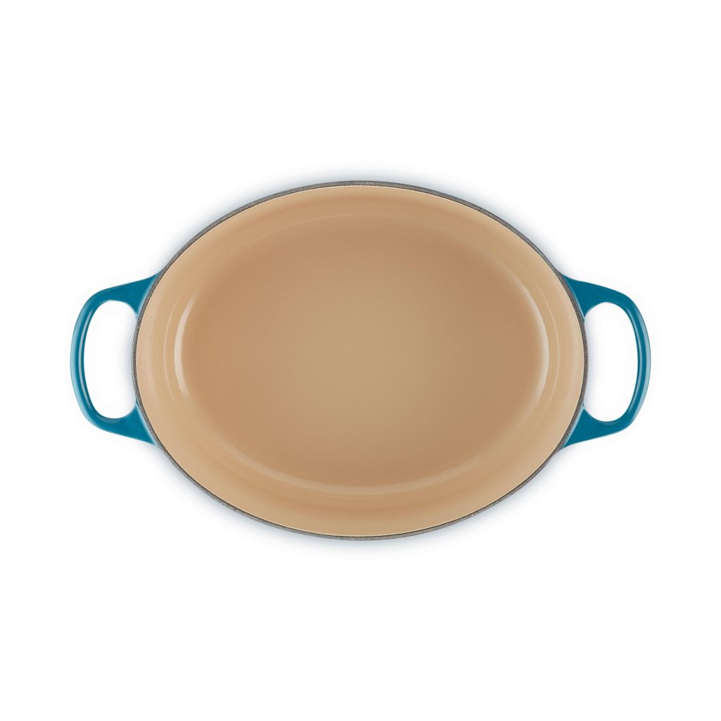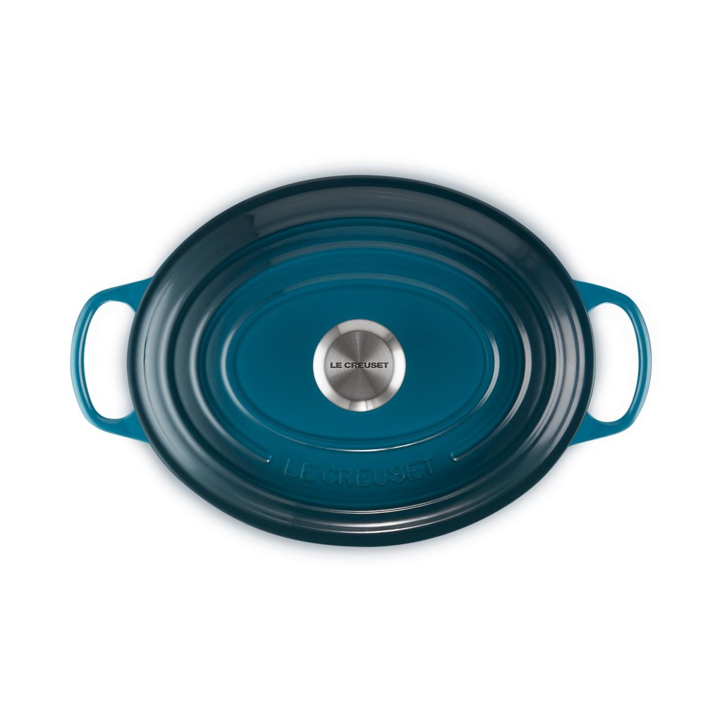 - Tava ovală fontă capac pentru caserolă Le Creuset în culoarea DEEP TEAL este un ajutor universal în bucătărie, suficient de spațioasă pentru a coace o pulpă întreagă de miel și, în același timp, suficient de îngustă pentru a lăsa loc în cuptor pentru garnituri.