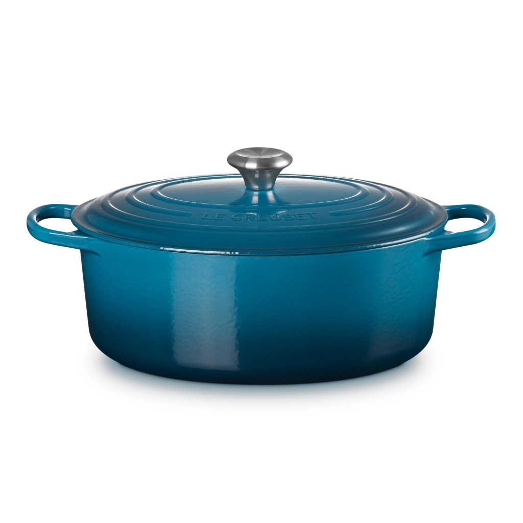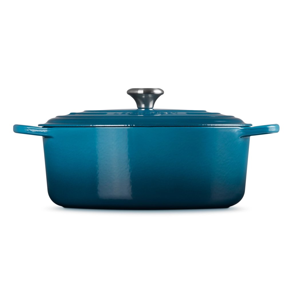 - Tava ovală fontă capac pentru caserolă Le Creuset în culoarea DEEP TEAL este un ajutor universal în bucătărie, suficient de spațioasă pentru a coace o pulpă întreagă de miel și, în același timp, suficient de îngustă pentru a lăsa loc în cuptor pentru garnituri.