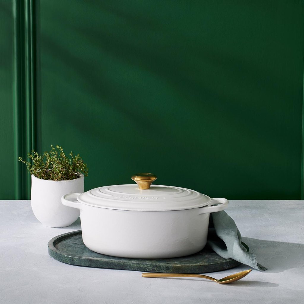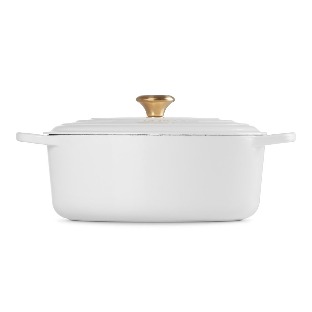 - Tava ovală fontă capac pentru caserolă Le Creuset în culoarea WHITE este un ajutor universal în bucătărie, suficient de spațioasă pentru a coace o pulpă întreagă de miel și, în același timp, suficient de îngustă pentru a lăsa loc în cuptor pentru garnituri.