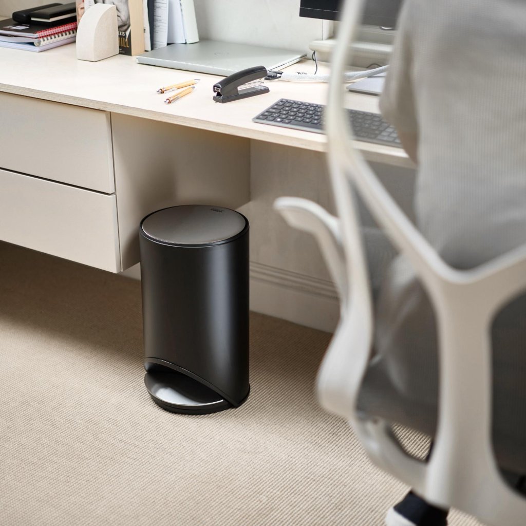 Negrul coș de gunoi ARC pare aproape discret, dar funcționează cu atât mai bine. Îl poți așeza lângă chiuvetă, în birou sau în dormitor și va încăpea pur și simplu acolo. Nu se impune, nu strigă, doar adună în liniște dovezi din viața ta de zi cu zi.