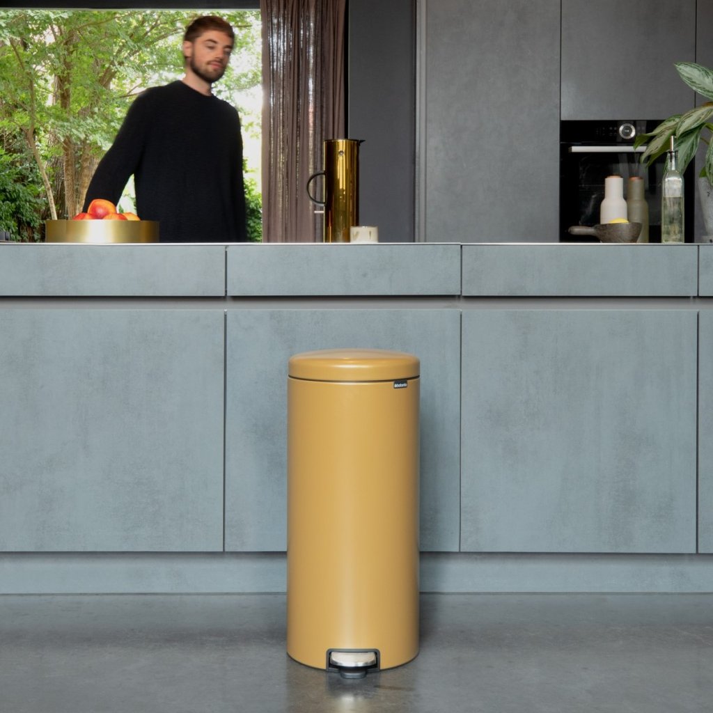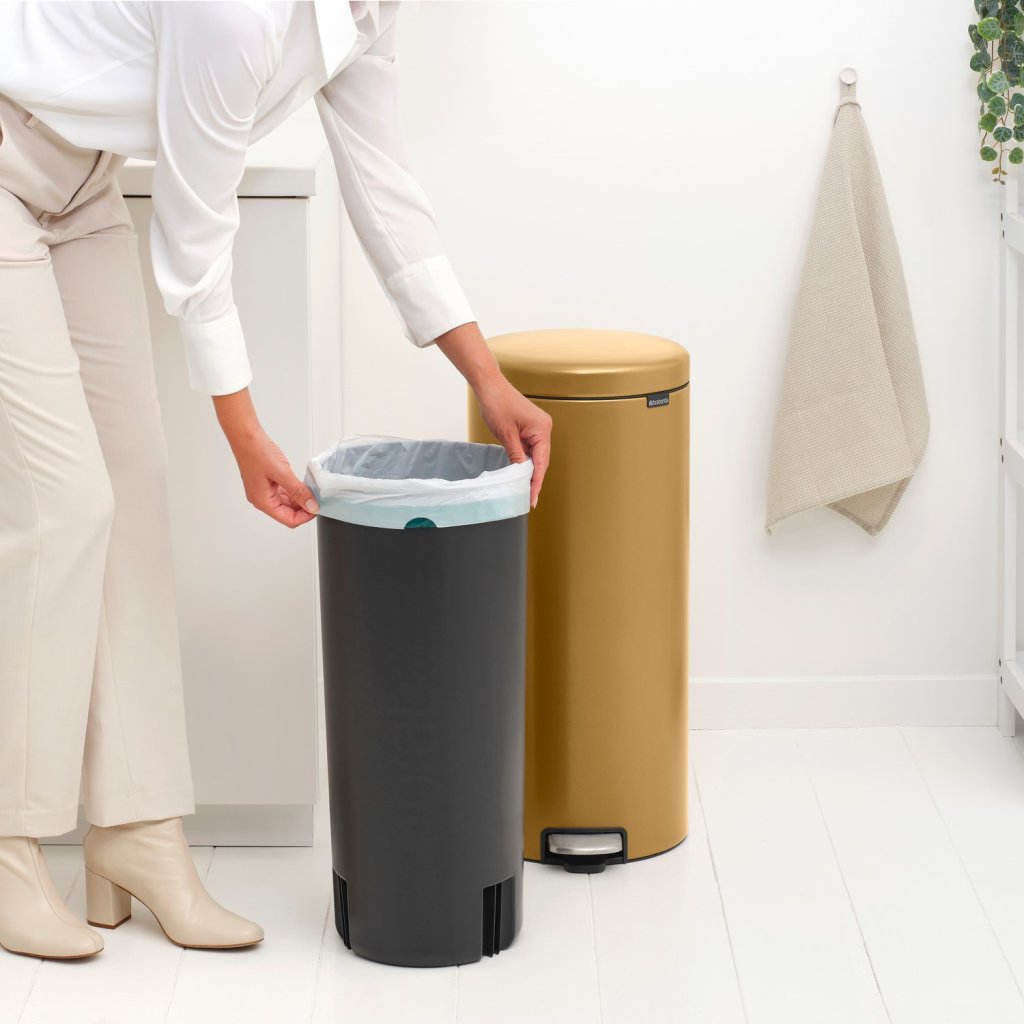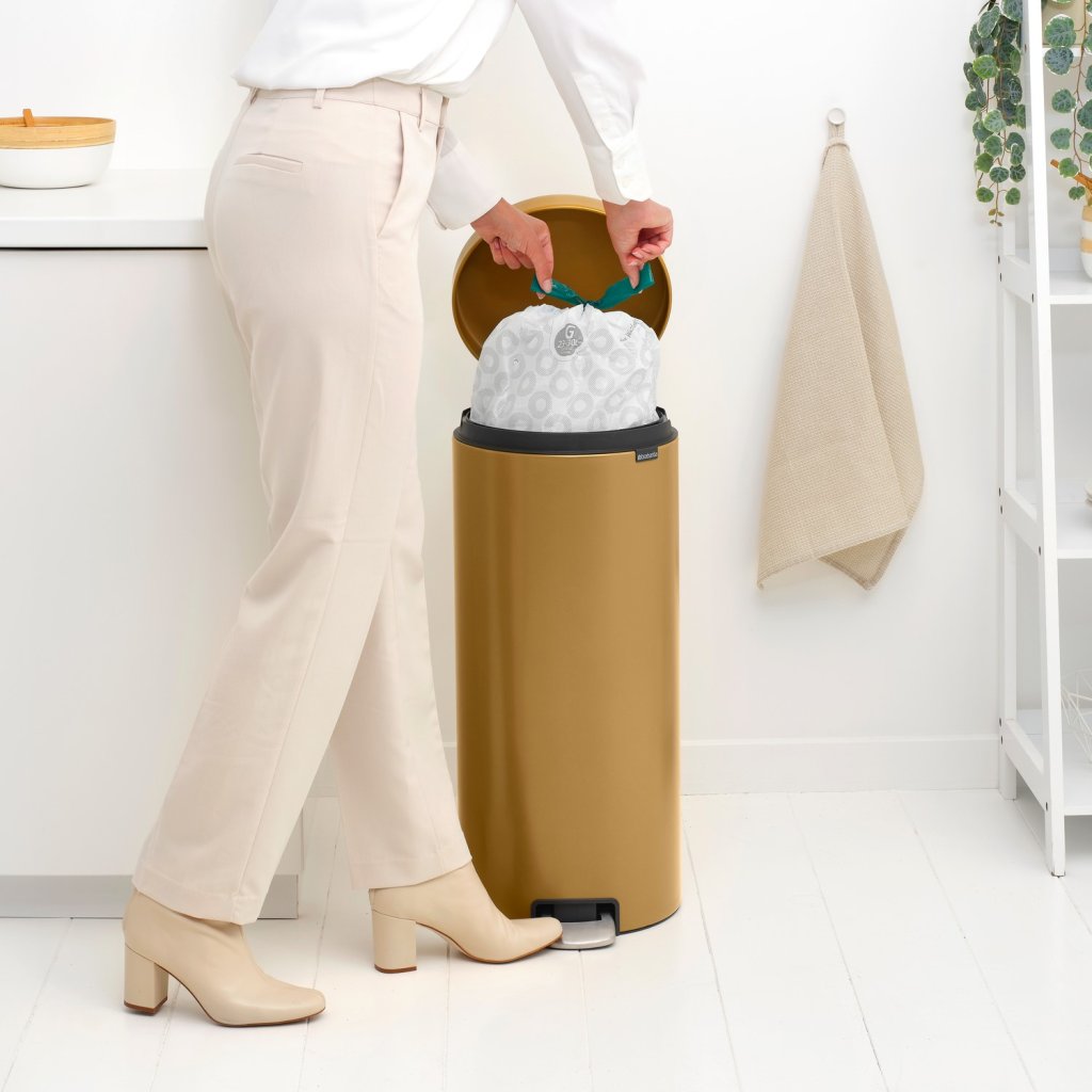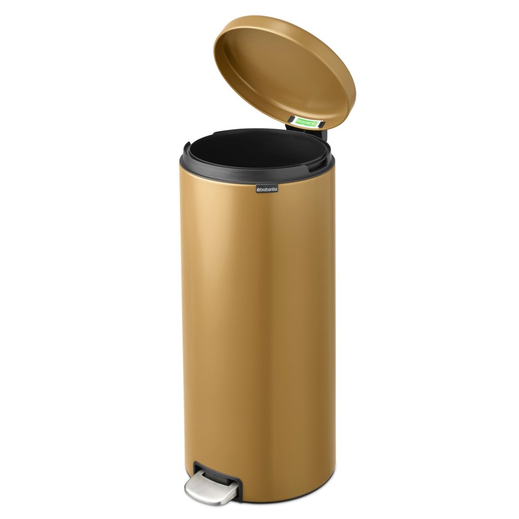 - coș cu pedală Brabantia NEWICON într-o nuanță aurie caldă este o soluție practică și elegantă pentru deșeurile de zi cu zi