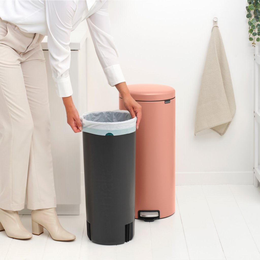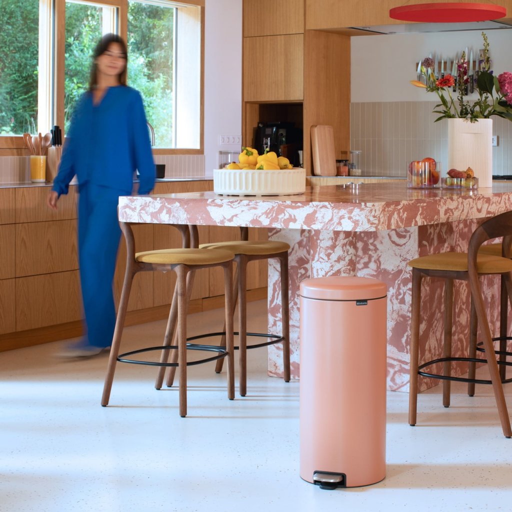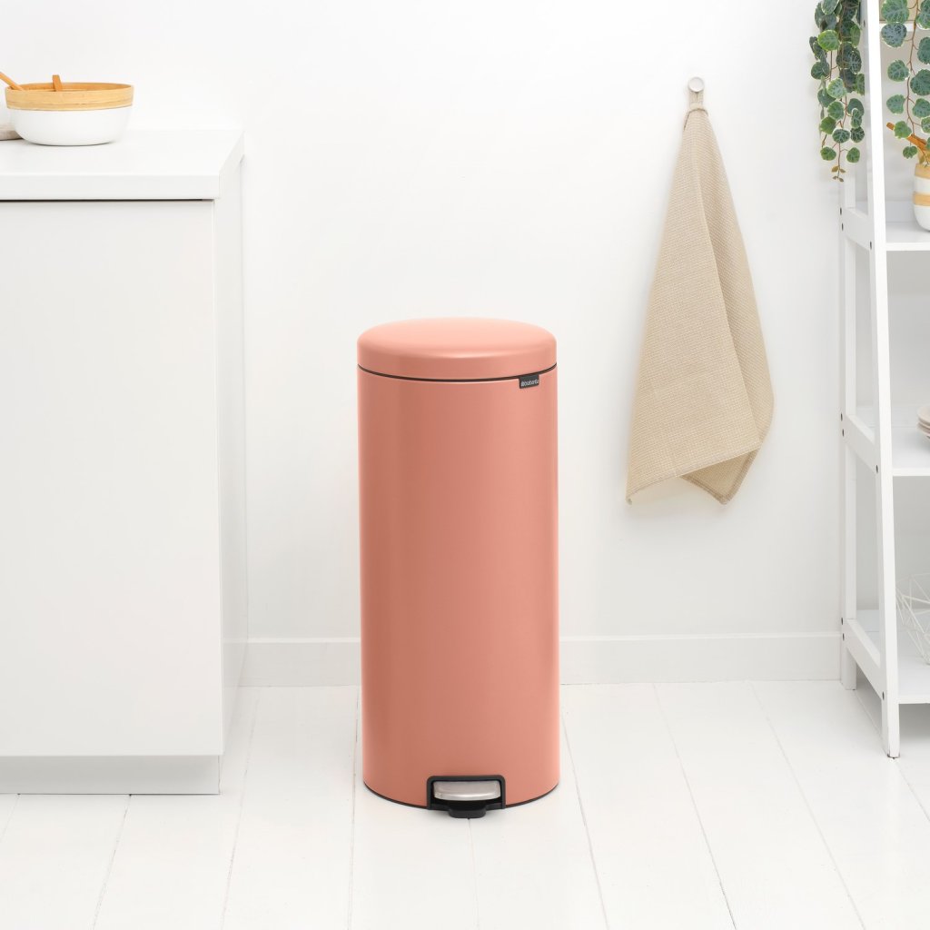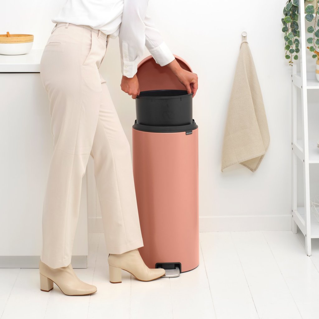 - coș cu pedală Brabantia NEWICON într-o nuanță caldă culoarea cuprului este o soluție practică și elegantă pentru deșeurile de zi cu zi