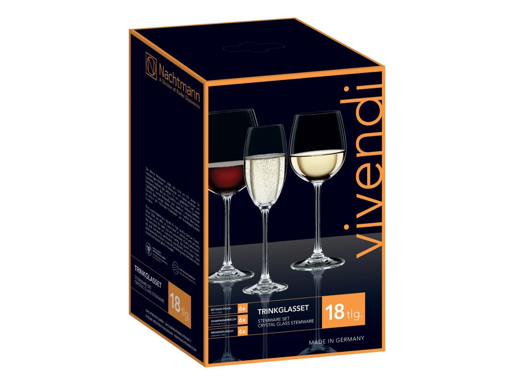 Pachetul convenabil de 18 pahare de vin (6 bucăți pentru vin roșu, 6 bucăți pentru șampanie tip flaut, 6 bucăți pentru vin alb tip ghiocel) din colecția Vivendi Premium a producătorului german Nachtmann este o piatră de temelie indispensabilă pentru dotarea unui bar sau a unei crame de casă. Durabilitate și funcționalitate într-un finisaj de cristal strălucitor pentru băuturile dvs. preferate, de la toast la digestiv.