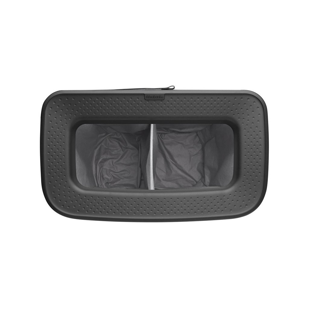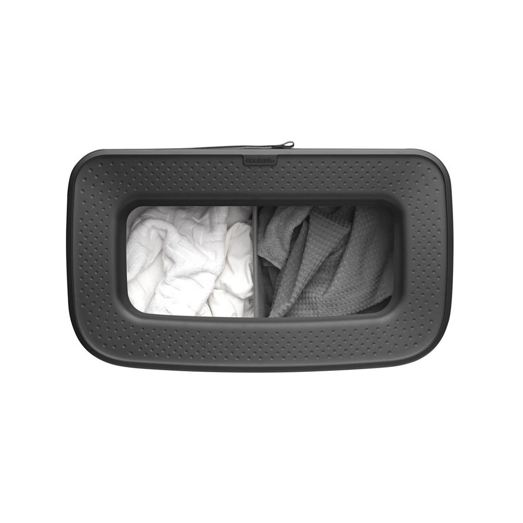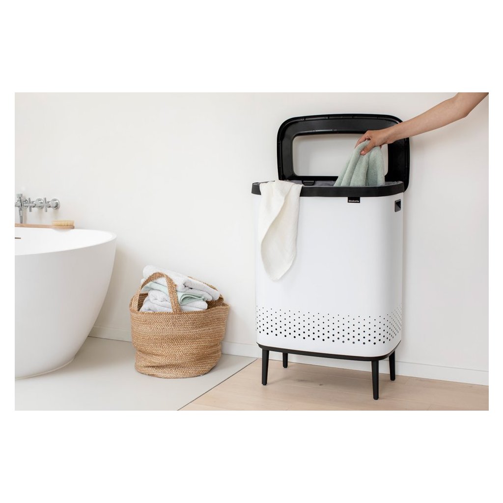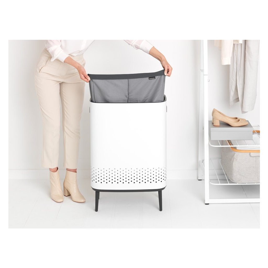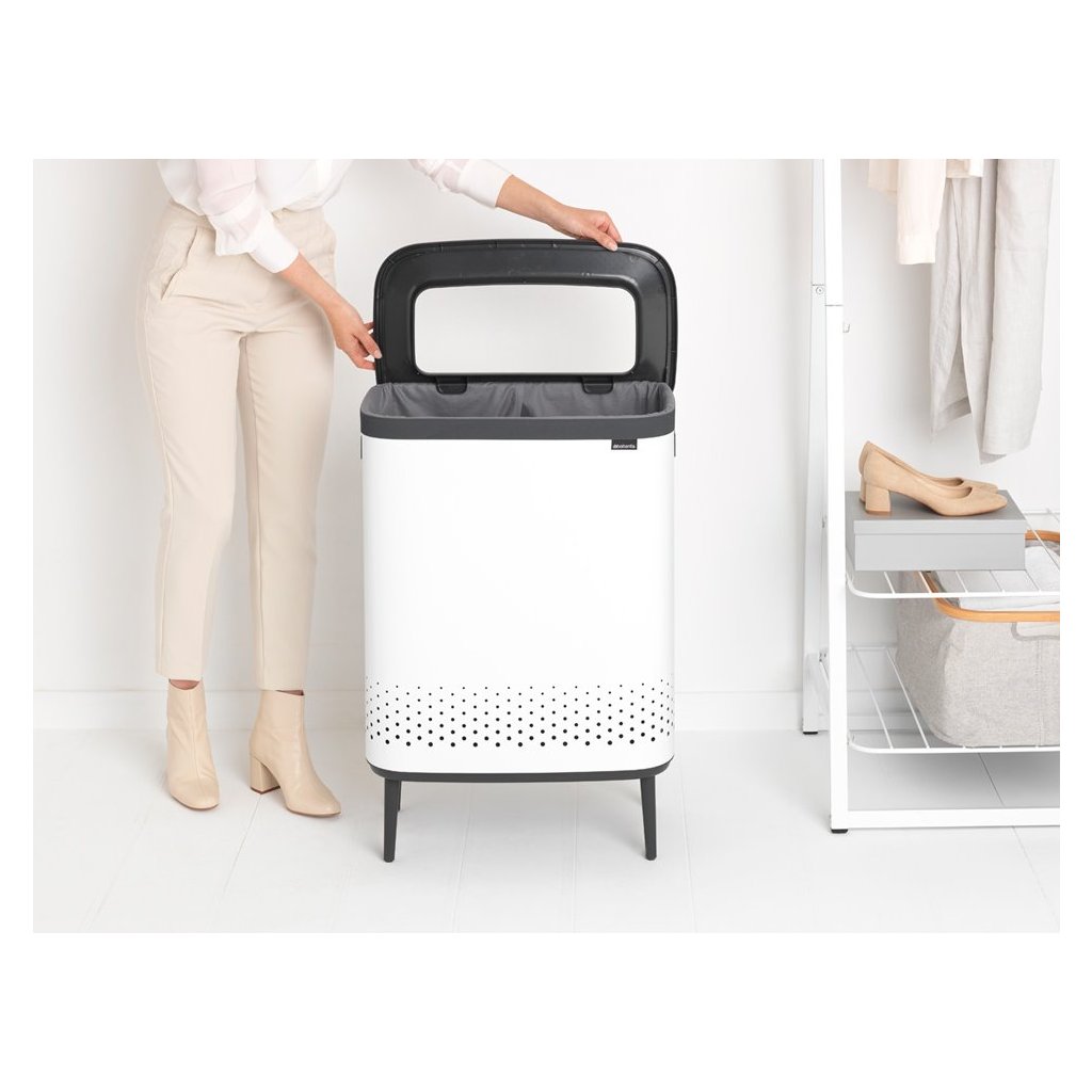 Coșul de rufe Bo 2 x 45 litri are două coșuri de rufe separate. Puneți rufele într-unul sau două compartimente fără a deschide capacul. Deschiderea Quick-drop vă lasă mâinile libere pentru a sorta rapid rufele.