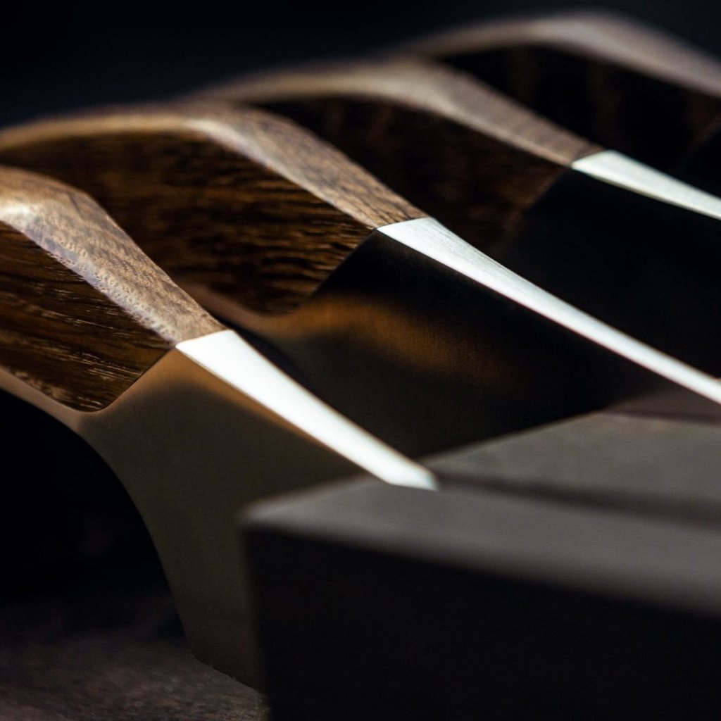 - material mâner: lemn masiv de stejar fumuriu, oțel crom molibden vanadiu (X50CrMoV15)