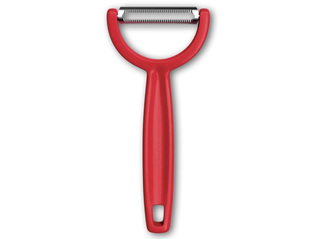 - Curățătorul de legume roșu Victorinox YPSO cu lamă zimțată este ajutorul ideal pentru curățarea ușoară și eficientă a legumelor și fructelor