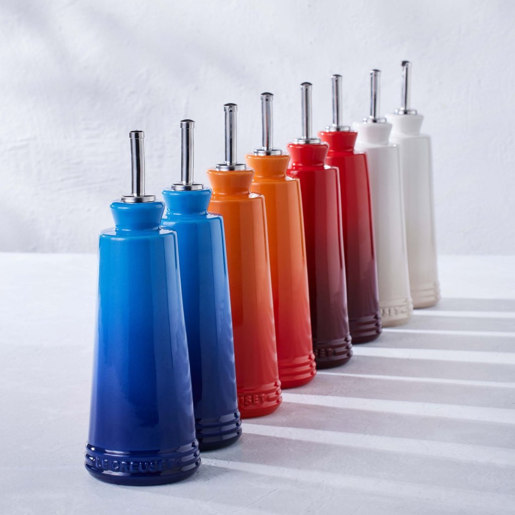 - Conține două recipiente ceramice - unul cu sigla Le Creuset pentru ulei și celălalt fără marcaje pentru a face ușor diferența între ulei și oțet.