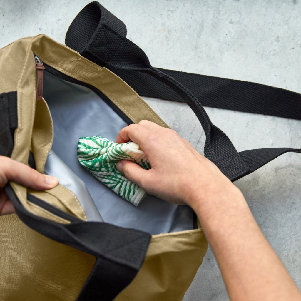 - material: oțel (fermoar), polipropilenă (curea de fixare), PET reciclat poliester (exterior material textil), BPA și PEVA pentru alimente (căptușeală interioară cu cusături sudate)
