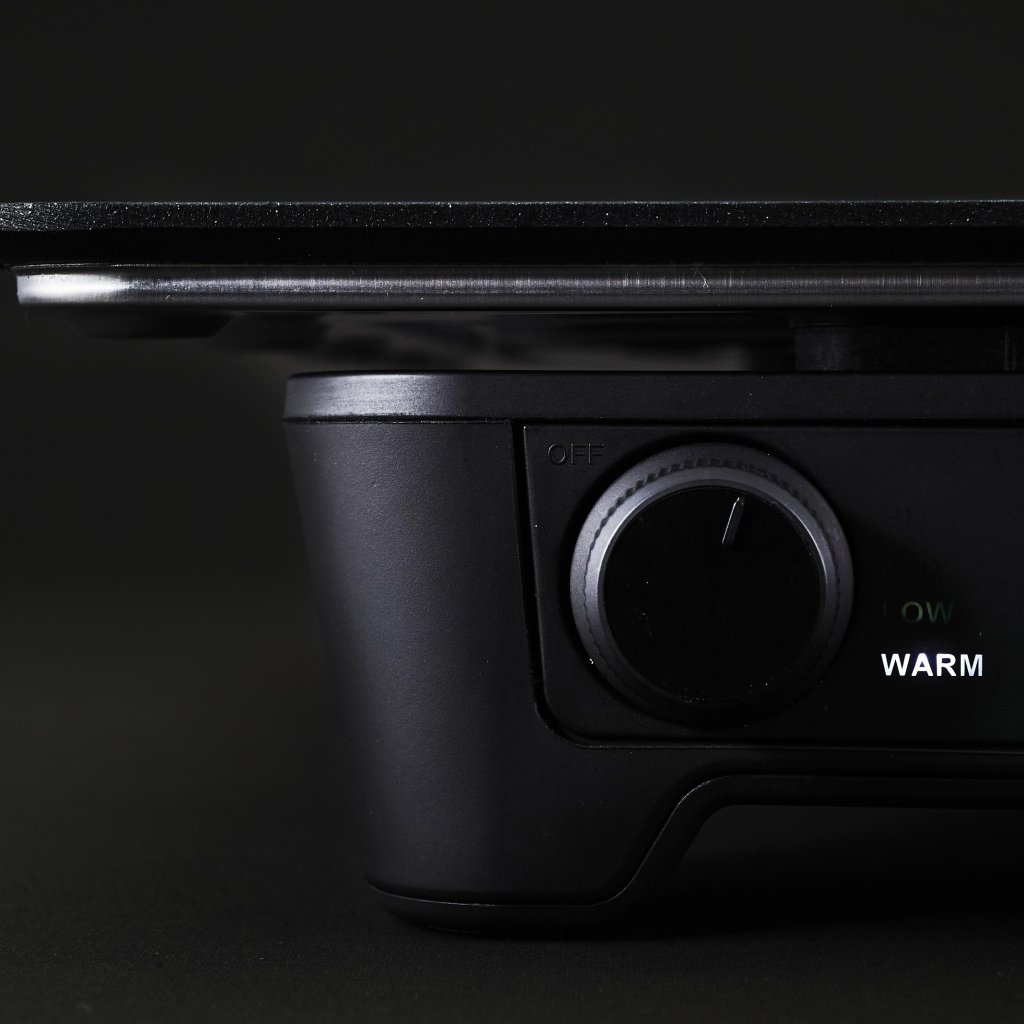 - Cu un singur buton rotativ, puteți selecta una dintre cele patru temperaturi (100 °C, 150 °C, 190 °C sau 250 °C) pentru a adapta grătarul atât la gătit lent, cât și la grătar rapid.