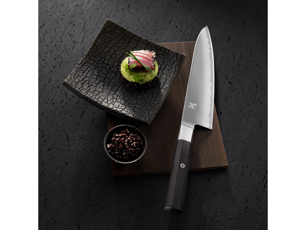 Cuțitul japonez extrem de ascuțit GYUTOH impresionează prin lama sa stabilă în formă japoneză autentică. Cuțitul are o putere de tăiere excepțională și este ideal pentru a tăia carnea în felii și cubulețe. Vârful mai înalt este optim pentru tăierea în stil leagăn/alunecare. Lama lungă de 24 cm și mânerul octogonal durabil se potrivesc bine în mână și sporesc siguranța de prindere. Cuțitul GYUTOH a câștigat popularitate și în rândul bucătarilor în stil occidental.