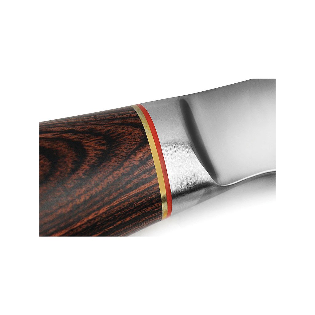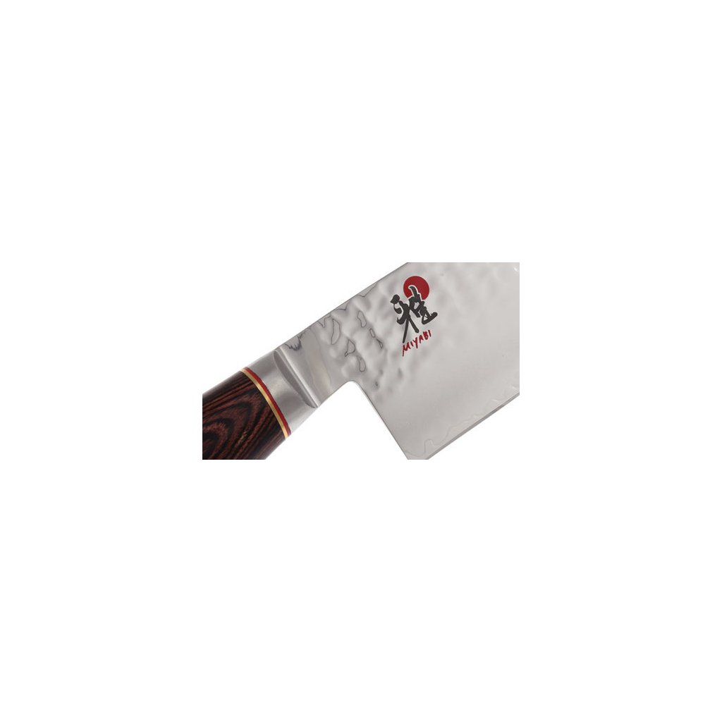 Seria de cuțiteMIYABI 6000MCT combină funcționalitatea perfectă, designul unic și estetica. Proprietățile lor impresionante vor fi apreciate de orice profesionist și de orice novice entuziast în ale gătitului. Cuțitele japoneze sunt unice, în principal datorită designului lamei și al mânerului lor. Fiecare cuțit în parte este rezultatul unui meșteșug autentic din "Orașul cuțitelor" Seki. Miezul extrem de dur din pulbere de oțel Micro Carbide MC63 este învelit în 2 straturi de oțel. Finisajul special al lamei Tsuchime este forjat manual, suprafața texturată creează un aspect original funcțional. În Japonia, Tsuchime este comparat cu luna care se reflectă pe suprafața oceanului. Depresiunile rezultate împiedică în mod eficient lipirea ingredientelor feliate, iar cuțitul este extrem de puternic. Pentru a obține proprietăți și mai bune ale oțelului, a fost utilizat un proces unic de călire CRYODUR®, în timpul căruia acesta este înghețat la -196°C. Materialul rezultat se mândrește cu o duritate extremă de 63 Rockwell. Cuțitul este șlefuit manual simetric. Ascuțirea manuală tradițională Honbazuke este dovedită de sute de ani de muncă a maeștrilor cuțitari. Este un proces de ascuțire în mai multe etape, în care cuțitul este mai întâi ascuțit cu ajutorul unei pietre de șlefuit verticale și orizontale rotative, iar la final lama este lustruită cu o bandă de ascuțire din piele. Mânerul robust din lemn exotic Cocobolo Pakka nu este doar perfect echilibrat , ci și stabil din punct de vedere dimensional. Nuanța închisă a lemnului dă o impresie de lux. Materialul natural folosit simbolizează perfect respectul japonezilor pentru natură. Decorul sofisticat al mânerului constă în detaliile în stil asiatic - piciorul cu logo din oțel inoxidabil, știftul decorativ cu textură de mozaic și linia aurie și roșie aduc o experiență estetică puternică.