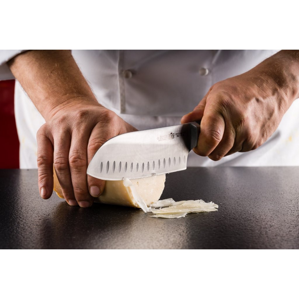Cuțitul Santoku are o utilizare versatilă. Lama este extrem de ascuțită. Lama cuțitului este fabricată din oțel inoxidabil german de calitate superioară. Sistem unic de echilibrare a cuțitului în funcție de nevoile bucătarului. Scutul protejează degetele. Tranziție lină între boltă și mâner. Mânerul ergonomic asigură o prindere sigură, confortabilă și plăcută pentru o muncă fără oboseală. Cuțitul este, de asemenea, potrivit pentru uz profesional. |