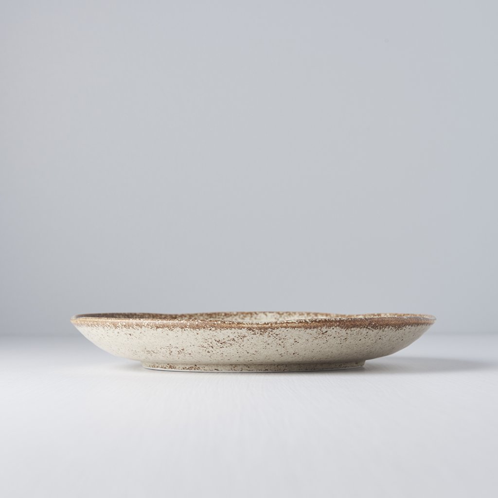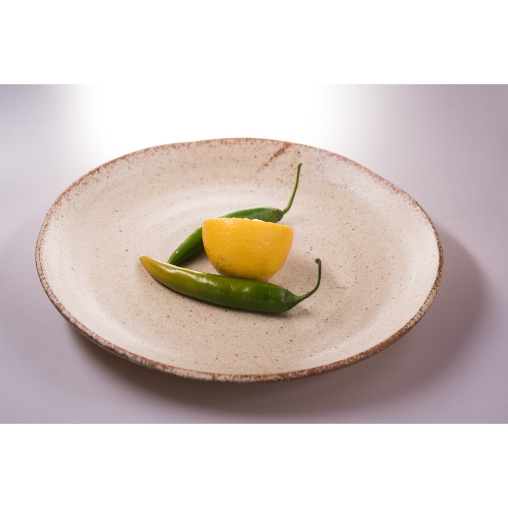 Are o culoare bej moale, cu decorațiuni delicate de culoare maro care înveselesc întreaga farfurie. Marginea farfuriei este neregulată și fin mărginită de culoare maro.