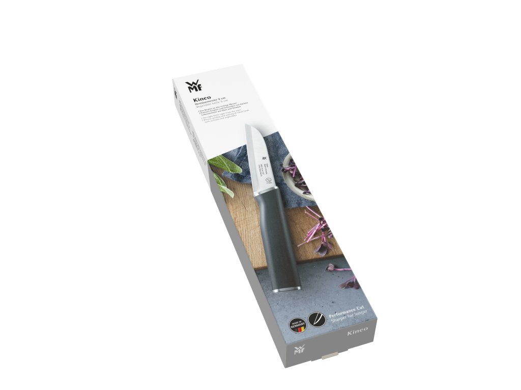 Un cuțit de legume la îndemână nu trebuie să lipsească din nicio bucătărie. Cuțitul Kineo cu lungimea lamei de 9 cm este fabricat din oțel inoxidabil întărit. Datorită tehnologiei patentate WMF Performance Cut , lamele au o ascuțire de durată excepțional de lungă. Cu el puteți tăia, decoji și decora cu ușurință orice legumă. Are un mâner ergonomic practic și este confortabil de ținut în mână. Fabricat în Germania, cu un raport preț/performanță perfect. Face parte din gama de cuțite de înaltă calitate Kineo.
