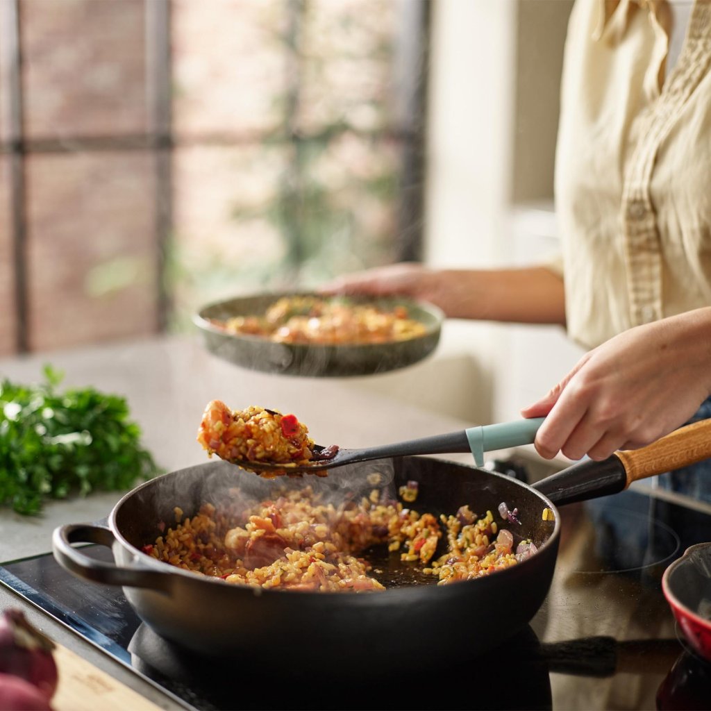 - Construcția ușoară facilitează manipularea la preluarea, întoarcerea și servirea preparatelor direct din tigaie pe farfurie.