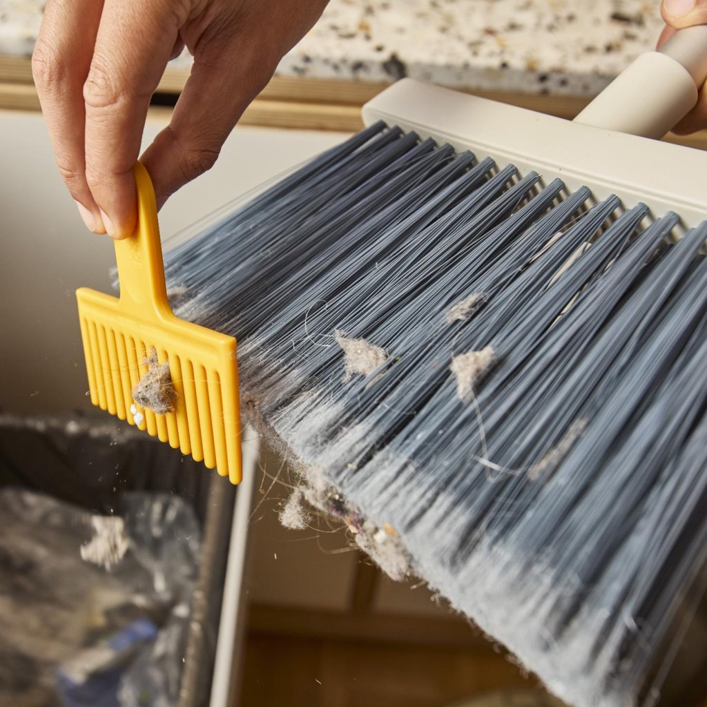 - Pieptenele de curățare cu peri integrați ajută la îndepărtarea ușoară a părului, scamelor sau prafului prinse, fără a fi nevoie să atingeți murdăria cu mâinile.
