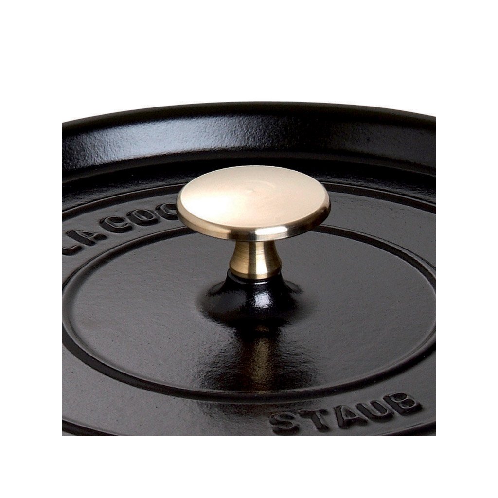 Mânerul rotund din alamă pentru capac de la marca franceză Staub se potrivește cu capacele pentru vasele de gătit Staub de dimensiuni mai mari. Mânerul este un element indispensabil pentru o manevrare comodă, dar și un element de design al vasului de gătit.