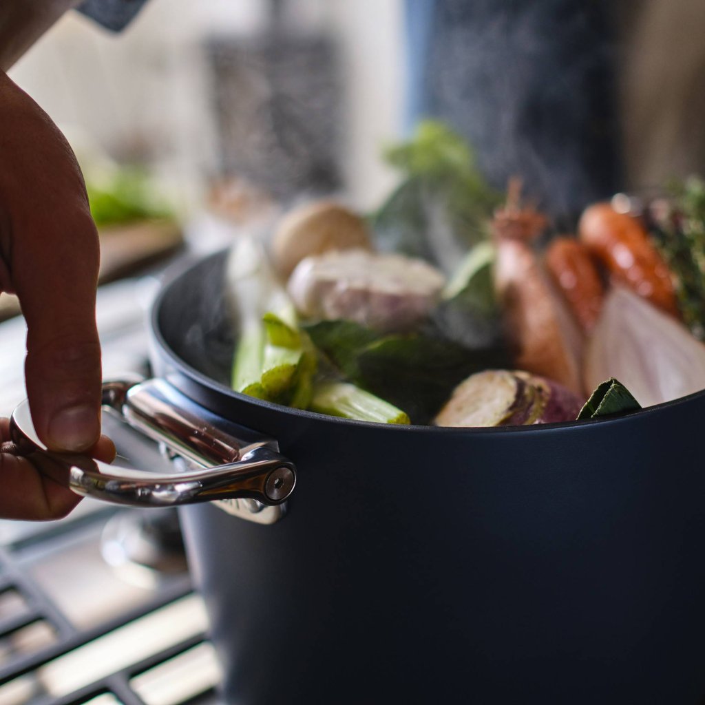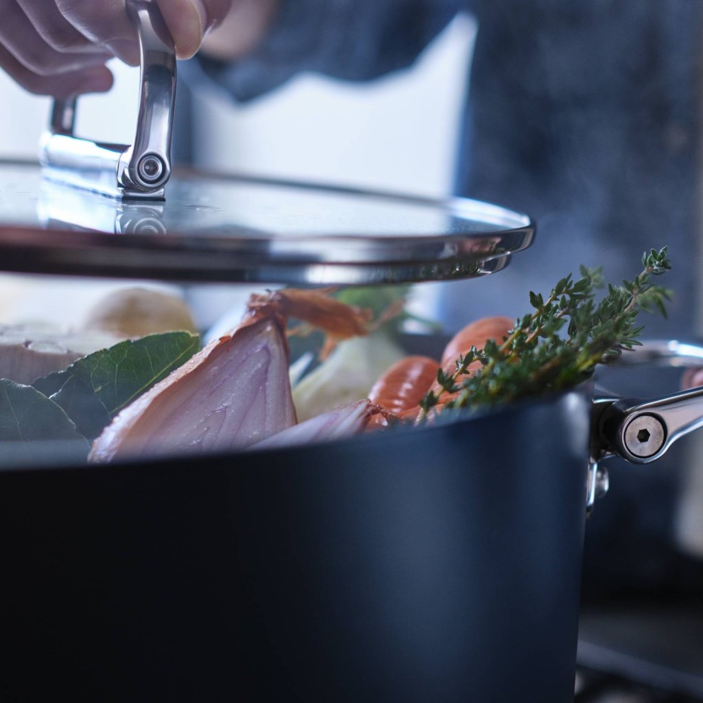 - Mânerele sunt bine fixate și permit manipularea în siguranță cu ambele mâini, chiar și atunci când transportați o oală complet plină.