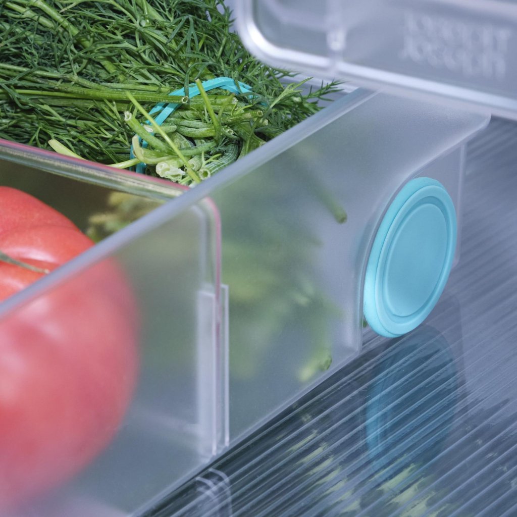 - Designul transparent al cutiei permite verificarea rapidă a conținutului, fără a fi necesară extragerea acesteia din frigider.
