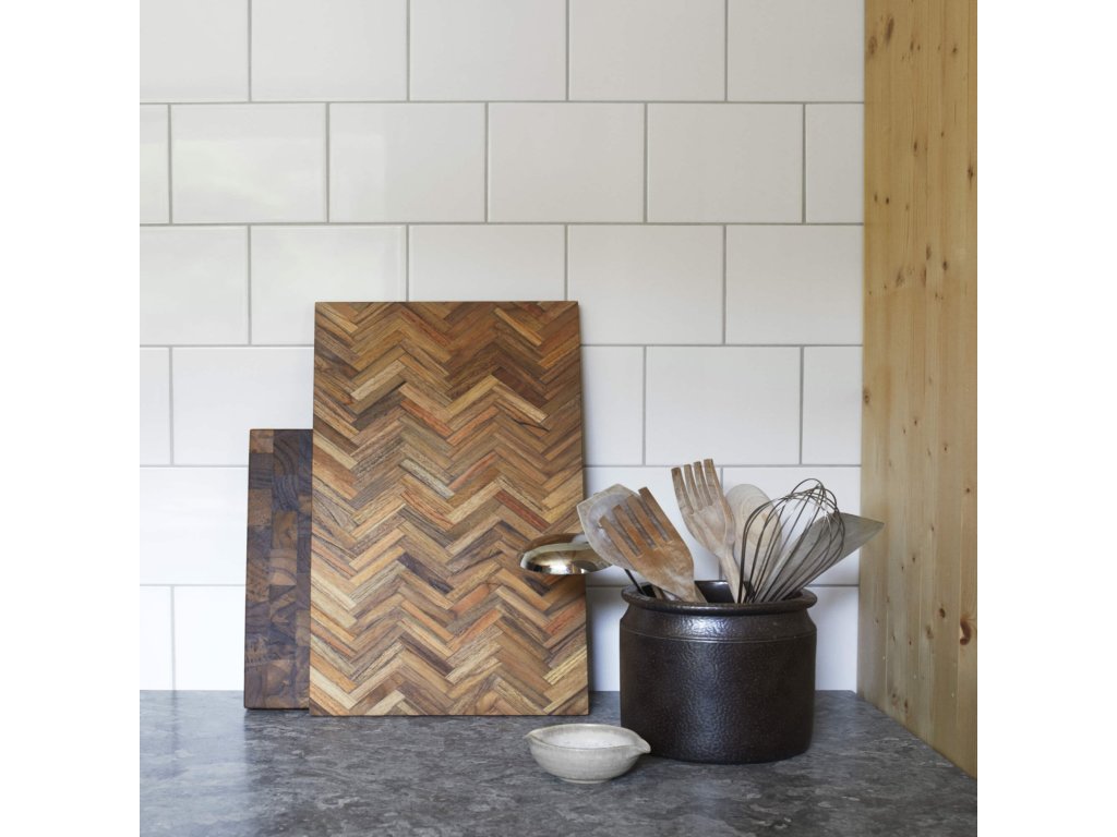 - fiecare piesă este unică datorită folosirii de bucăți mici de tec, care creează un mozaic dinamic de culori și texturi