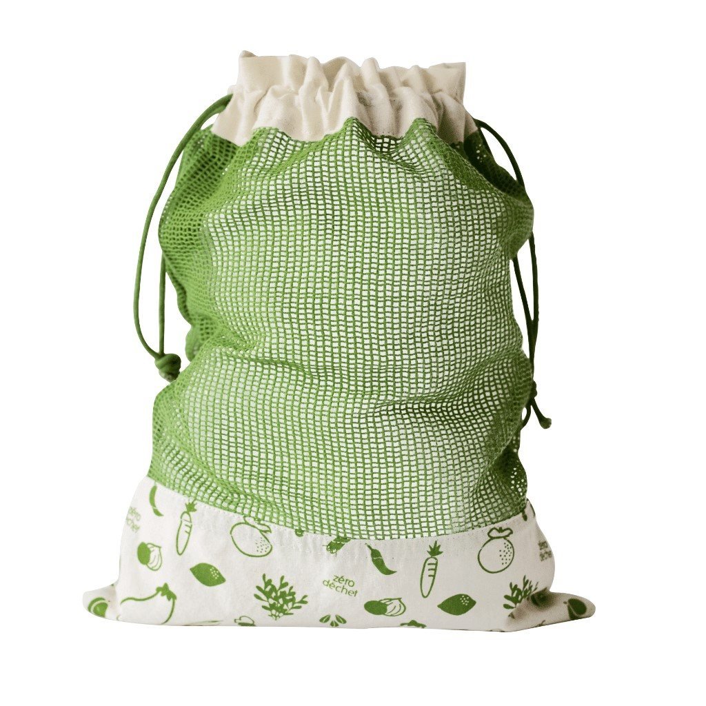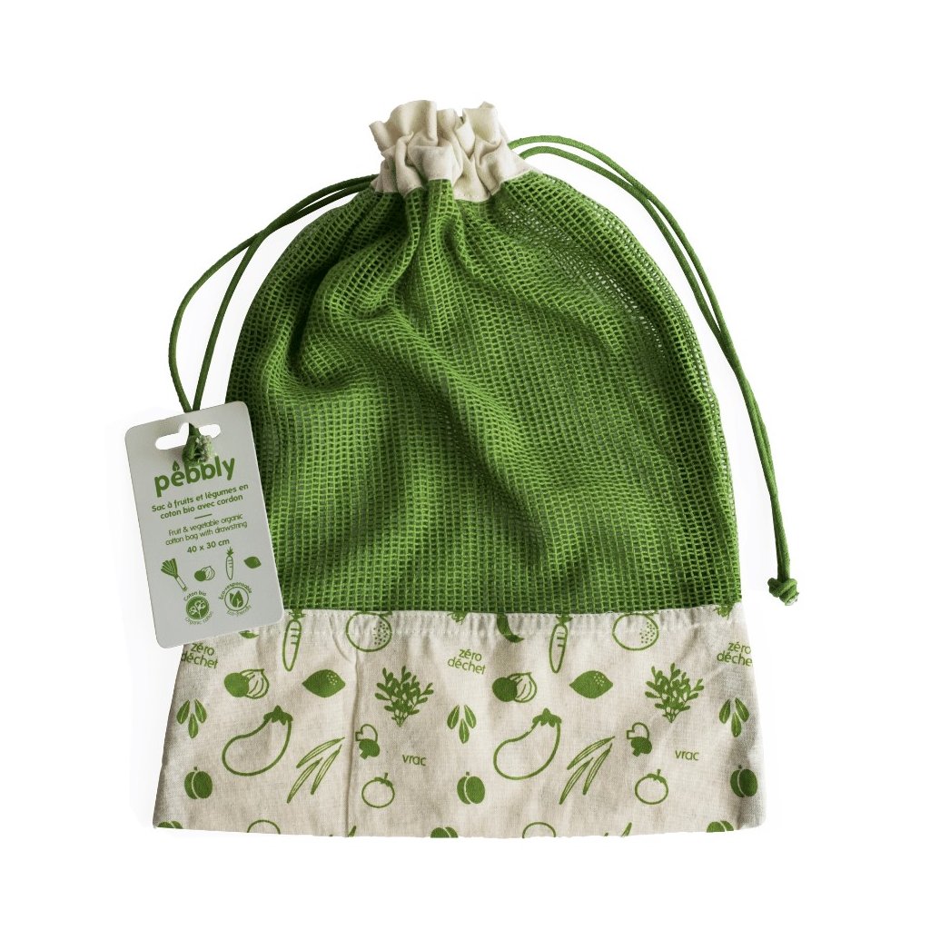 - Sacul de plasă verde Pebbly fabricat din material organic bumbac este un ajutor practic pentru cumpărăturile de fructe și legume fără ambalaje.