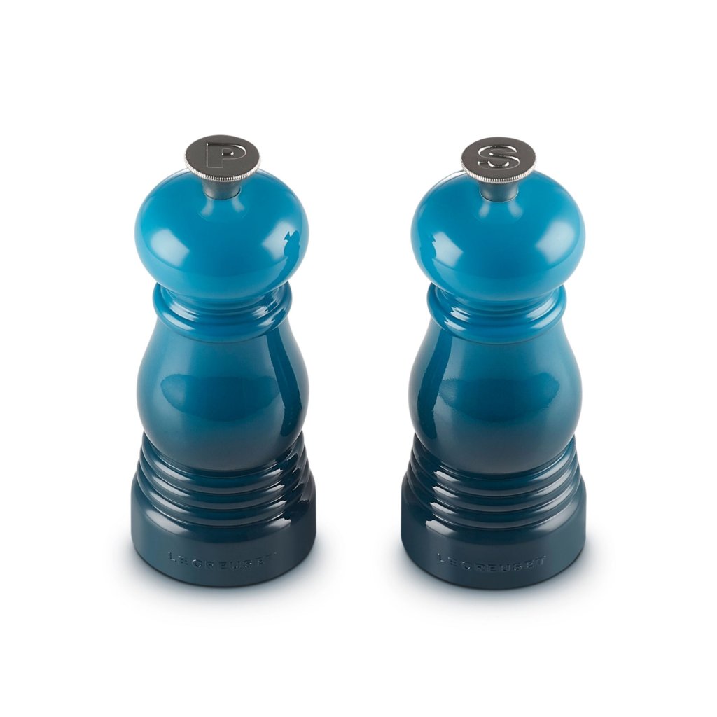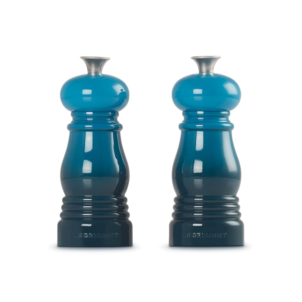 - Râșnițele de sare și piper mini set de Le Creuset în nuanța DEEP TEAL aduc în bucătărie stil, funcționalitate și bucuria condimentelor de zi cu zi.