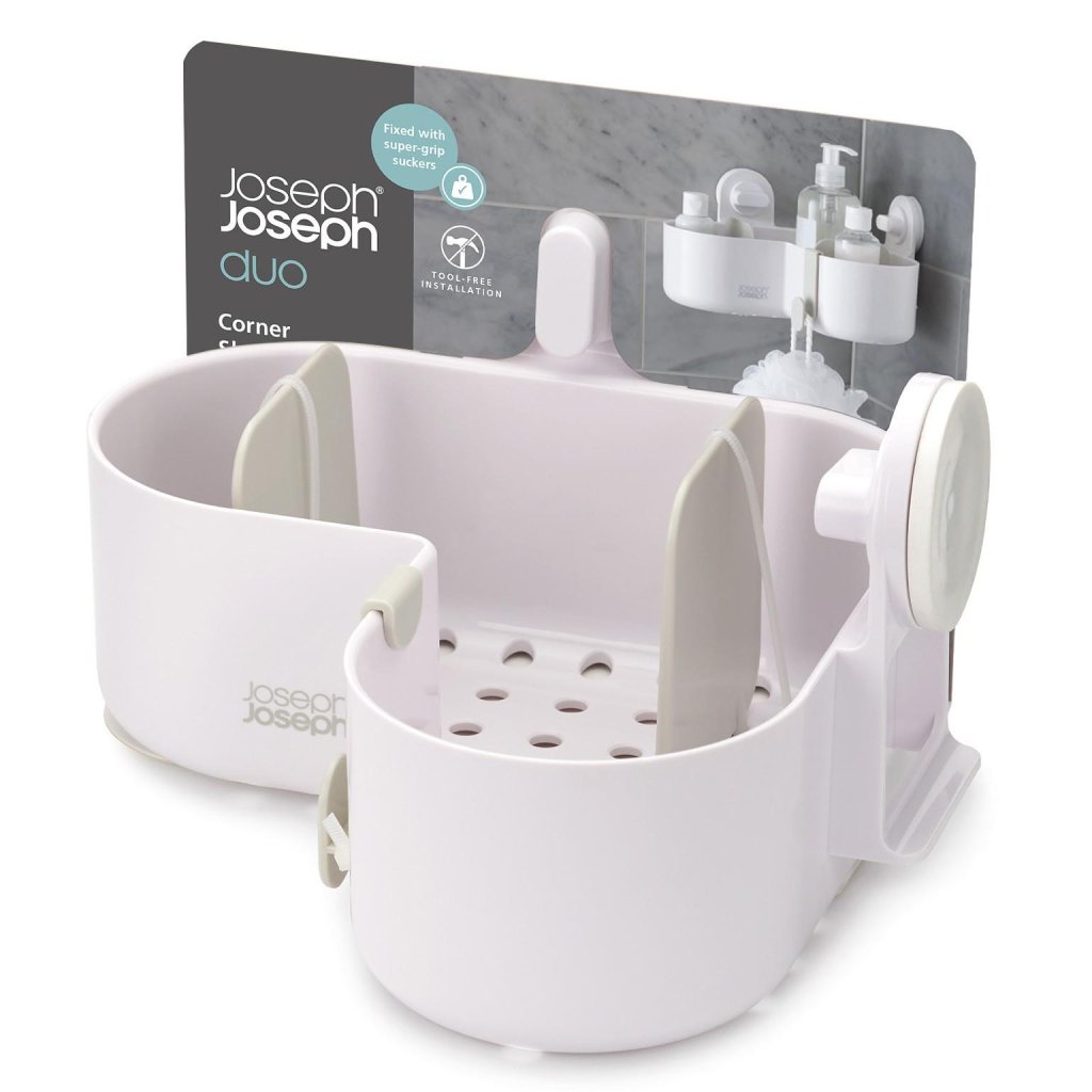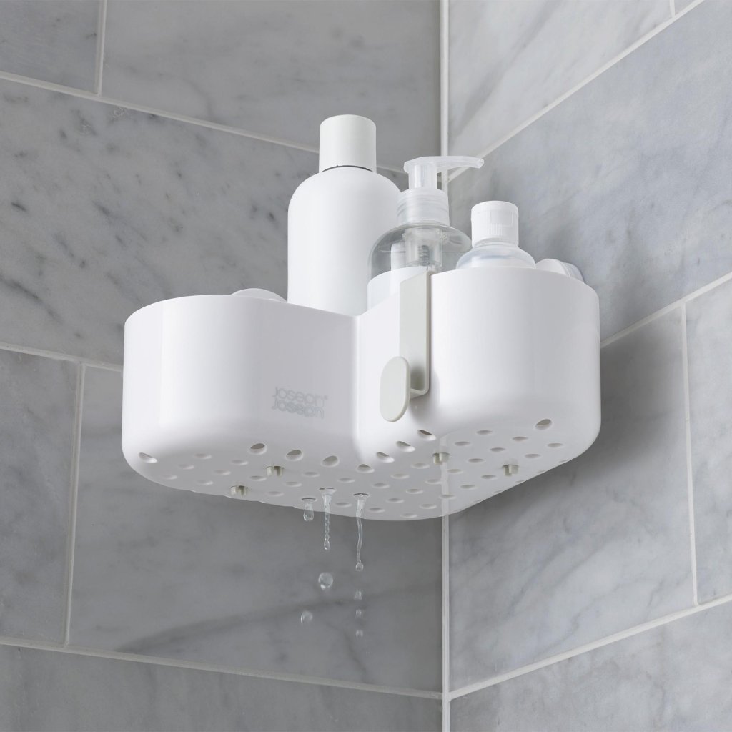 - Corner raft de duș Joseph Joseph DUO oferă o soluție practică și transparentă pentru depozitarea săpunului, șamponului și gelului de duș direct în zona dușului.