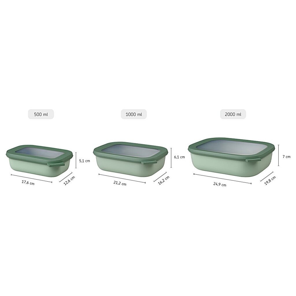 - dimensiunile practice de 500 ml, 1000 ml și 2000 ml vă permit să depozitați paste, salate, produse de patiserie sau porții de mese principale