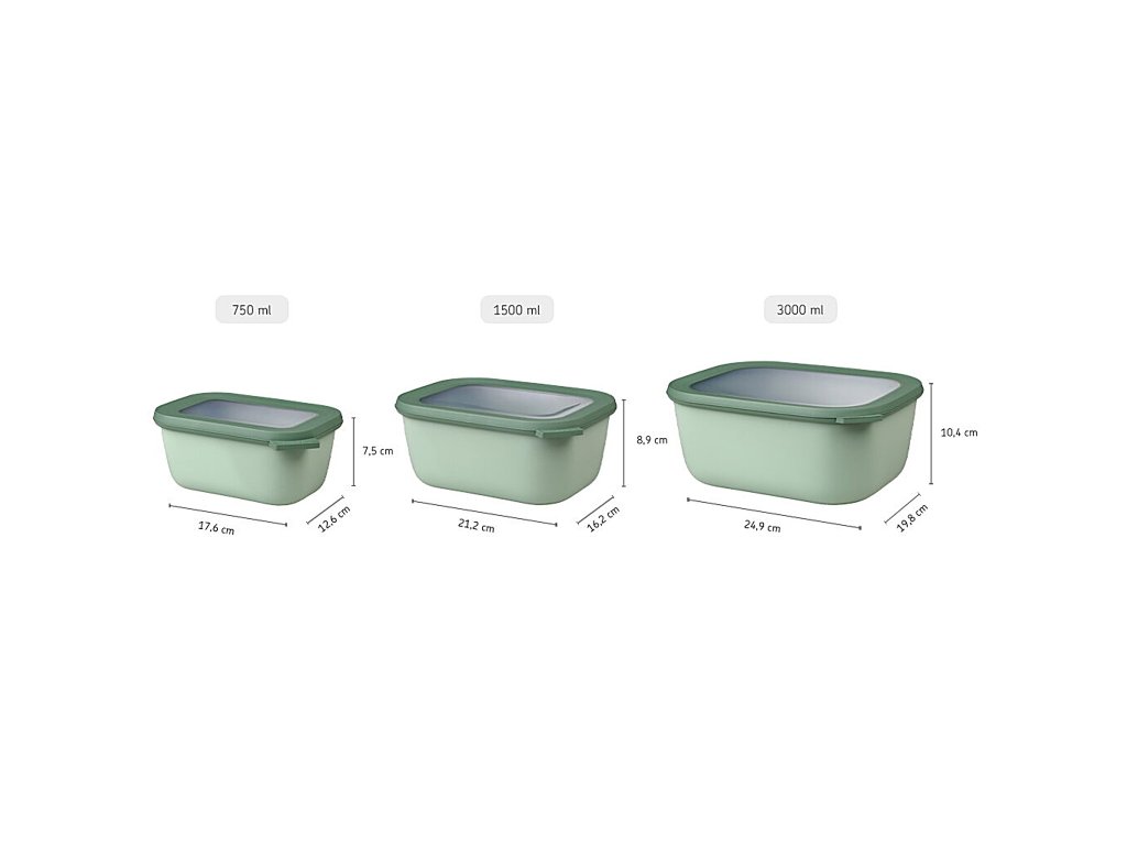 - dimensiunile practice de 750 ml, 1500 ml și 3000 ml vă permit să depozitați paste, salate, produse de patiserie sau porții de mese principale