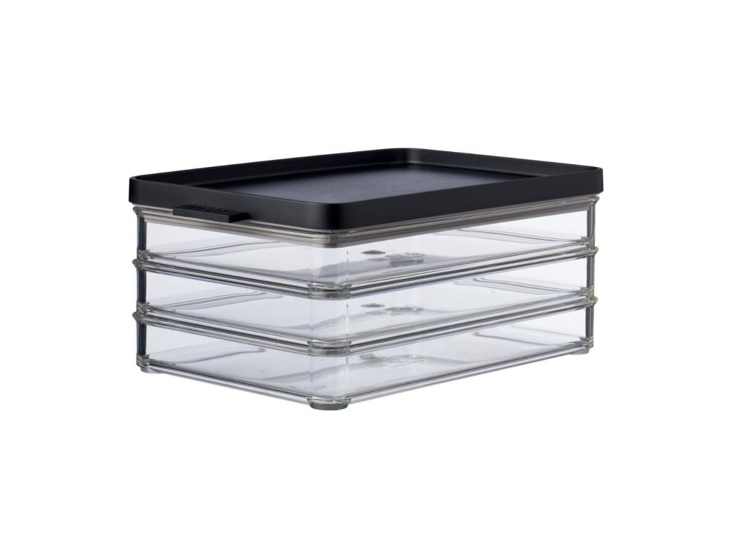 - fiecare dintre cele trei straturi transparente permite depozitarea separată a diferitelor alimente fără amestecarea gusturilor și mirosurilor