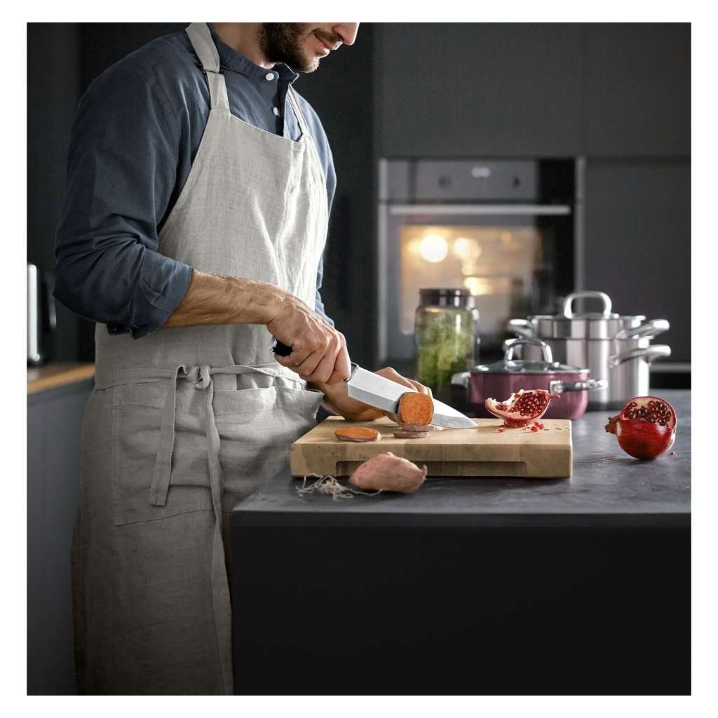 Cuțitul bucătarului cu o lungime a lamei de 20 cm are o lamă lată și rezistentă care prelucrează cu ușurință carnea, peștele și cele mai dure legume. Dar îl puteți folosi și pentru a toca ierburi sau pentru a tăia nuci - trebuie doar să puneți vârful cuțitului pe tocător și să mișcați lama în sus și în jos.