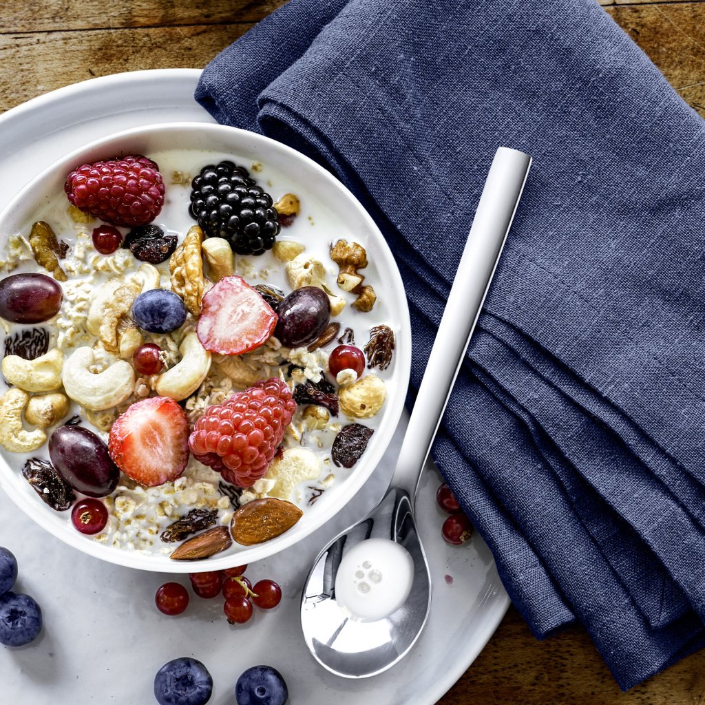 Lingura de muesli Nuova pentru un început de zi plăcut. Este puțin mai mare decât o lingură de cafea, dar mai mică decât o lingură de supă clasică. Este foarte rotunjită în partea din față, are o secțiune funcțională adâncă și nu va aluneca în interiorul bolului datorită mânerului ușor mai lung. Pe scurt, o lingură care se potrivește în mână și în gură, perfectă pentru a servi cereale cu lapte sau iaurt.