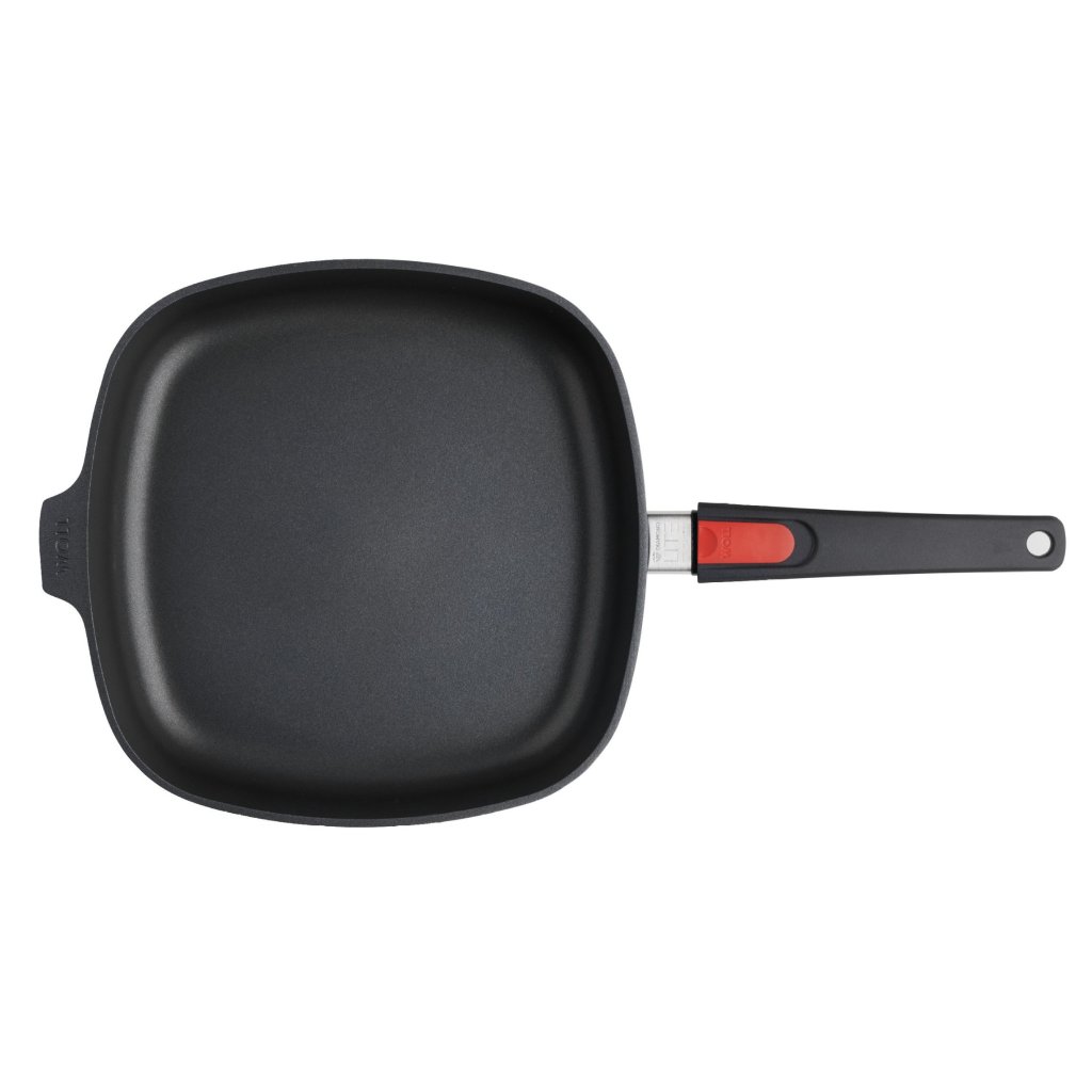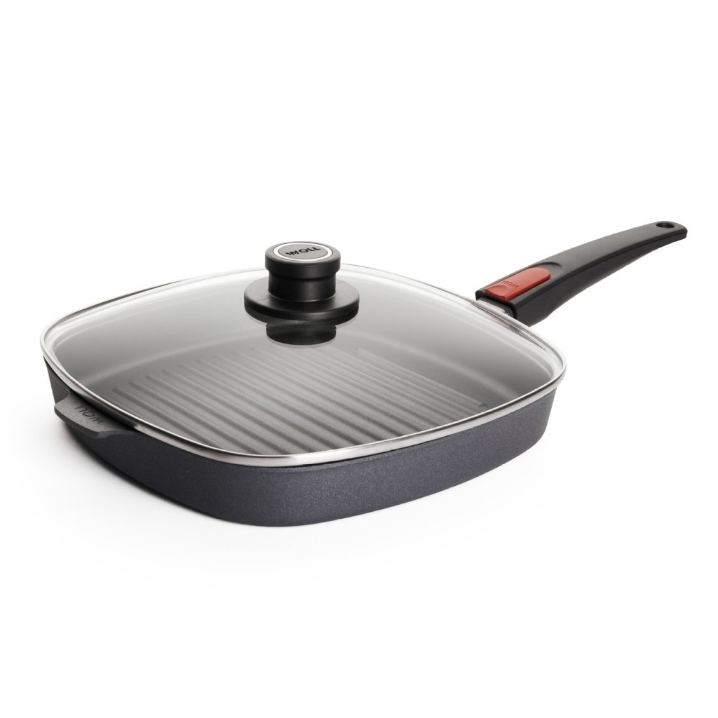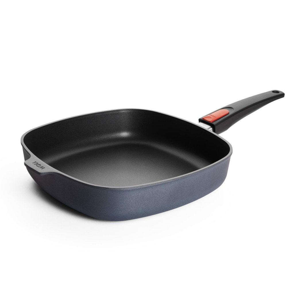 - Include o tigaie pătrată clasică și o tigaie pătrată tigaie pentru gratar cu capac sticlă , ambele cu dimensiunile de 28 × 28 cm și cu mâner detașabil pentru flexibilitate maximă.