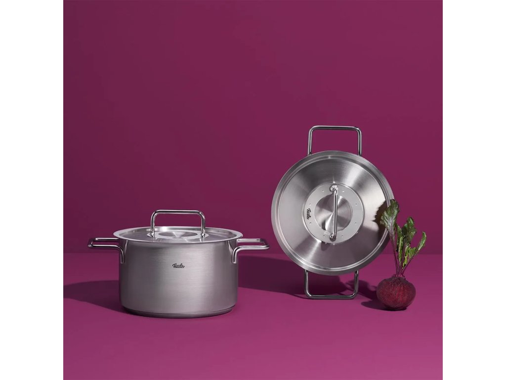 - mânerele din oțel inoxidabil lustruit rămân mereu reci și completează frumos finisajul satinat al vasului de gătit