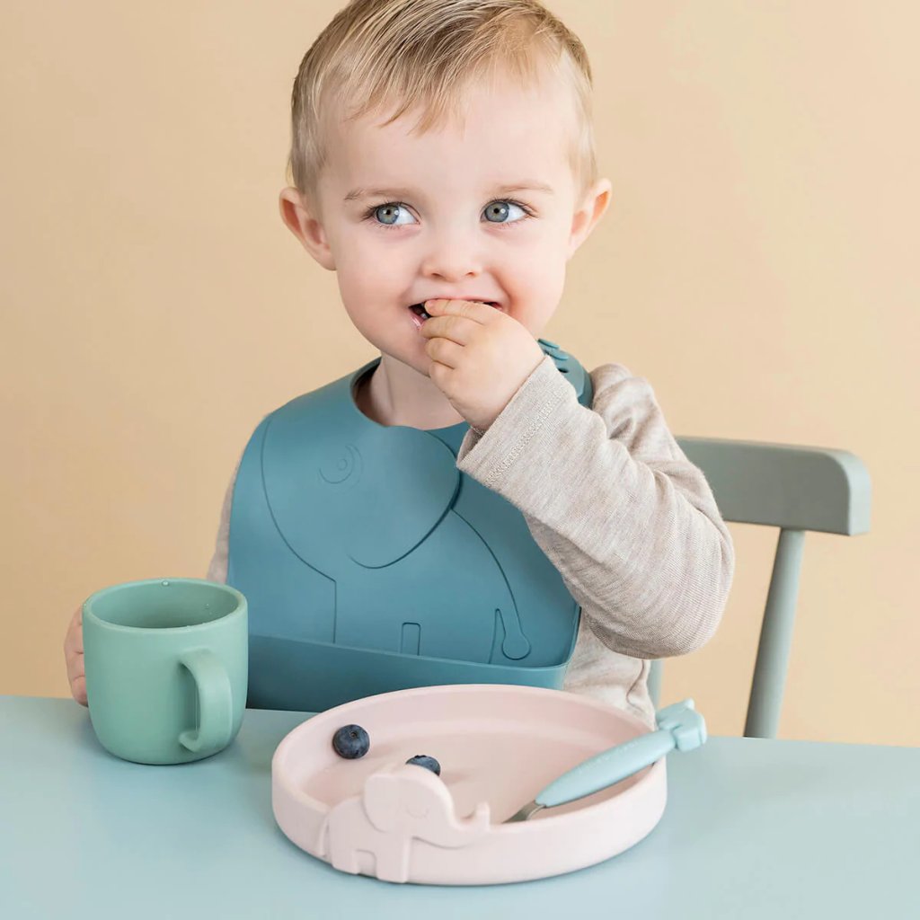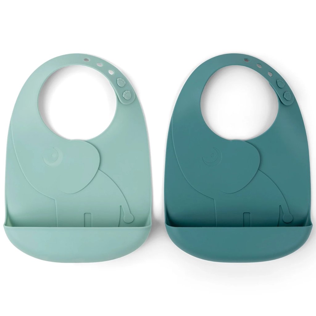 Bavetă pentru copii PEEKABOO ELPHEE, set de 2 bucăți, albastru, din silicon, Done by Deer