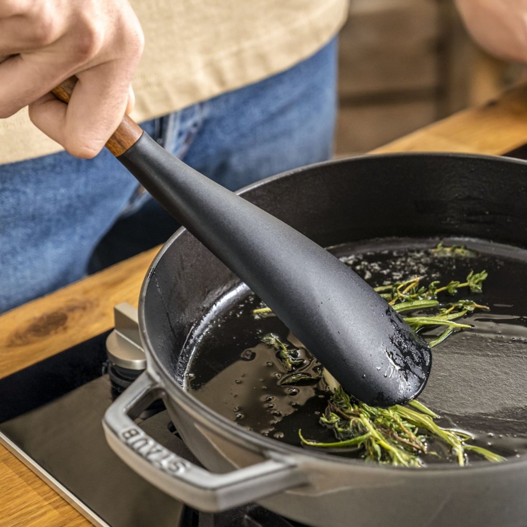 - partea de lucru realizată din silicon negru mat este perfect compatibilă cu vasele de gătit din fontă Staub