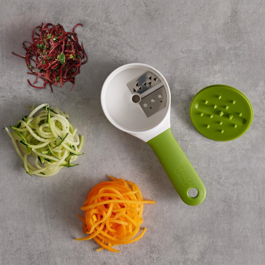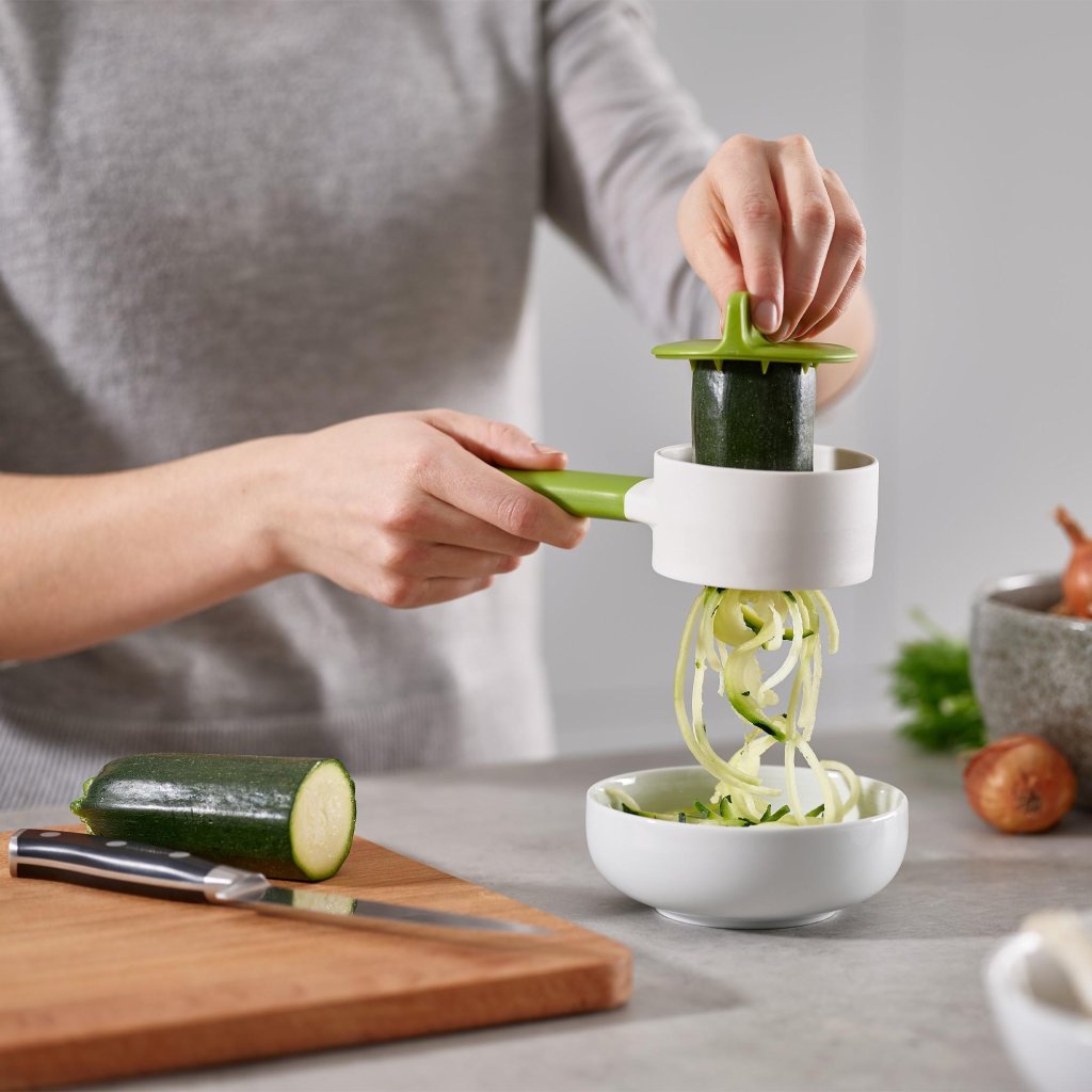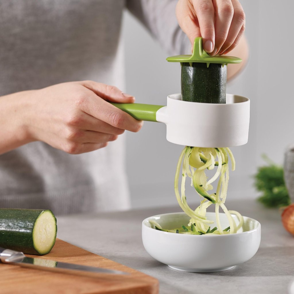 - Spiralizatorul Joseph Joseph DUO COMPACT este ajutorul ideal pentru pregătirea rapidă a unei cantități mici de legume direct deasupra bolului sau farfuriei.