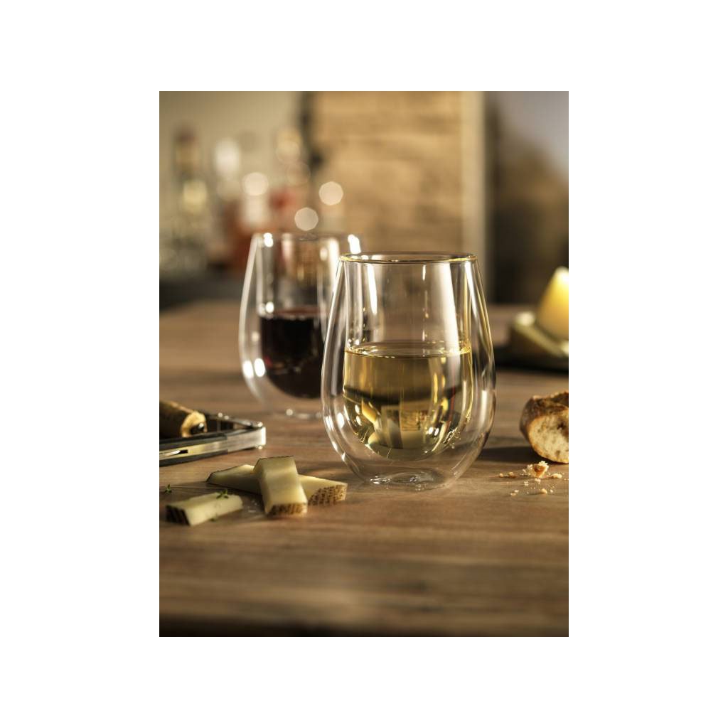 Temperatura potrivită joacă un rol crucial atunci când se bea vin. Paharele din seria Sorrento Bar sunt, prin urmare, echipate cu pereți dubli pentru a se asigura că mențin exact temperatura pe care o doriți. Pentru a le păstra proprietățile termice excelente a fost folosită sticlă borosilicată și fiecare piesă a fost, de asemenea, suflată manual. Paharele sunt ușoare, se pot spăla în mașina de spălat vase și vin într-un pachet de două.