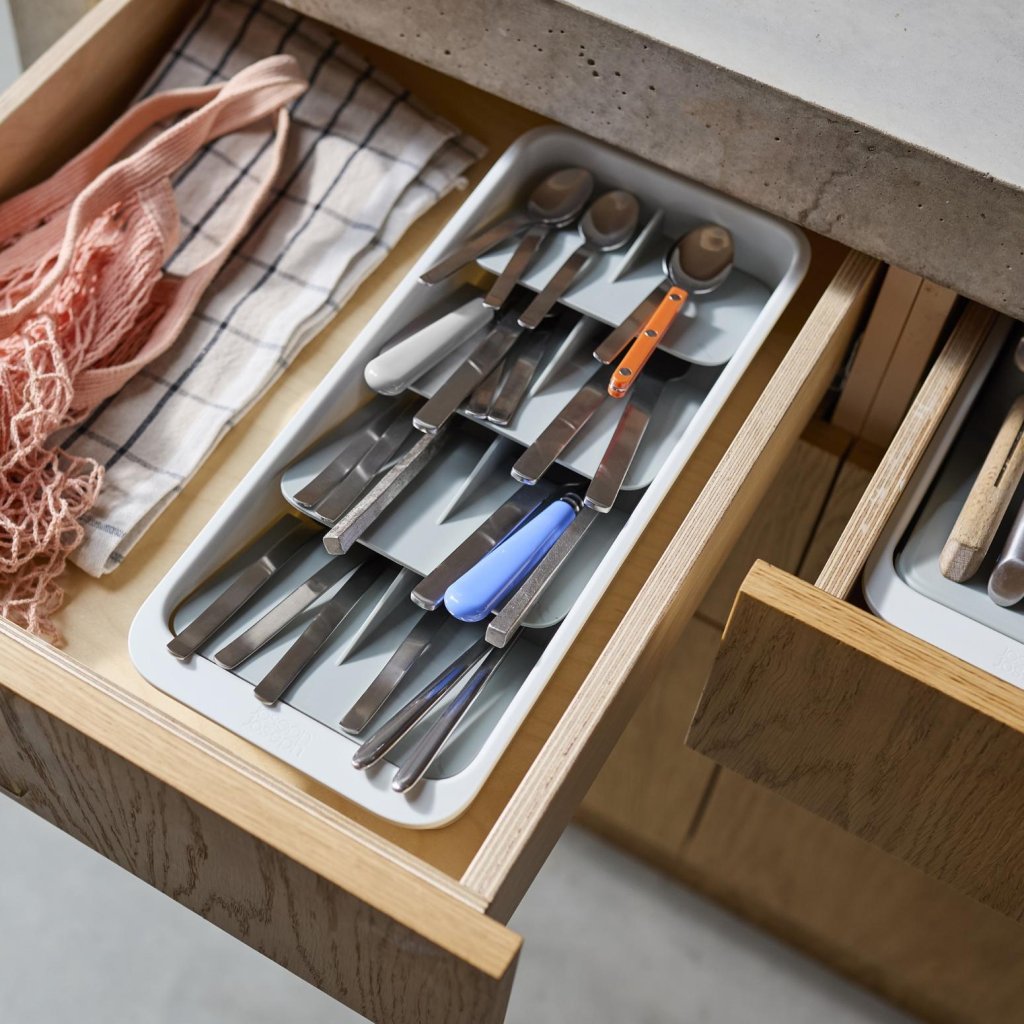 - Setul compact tavă pentru tacâmuri Joseph Joseph DRAWERSTORE ajută la organizarea ordonată a tacâmurilor chiar și în sertarele de bucătărie mai mici.