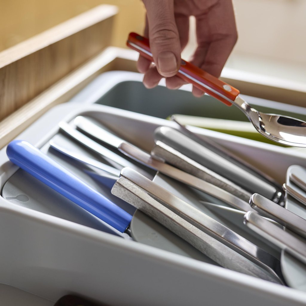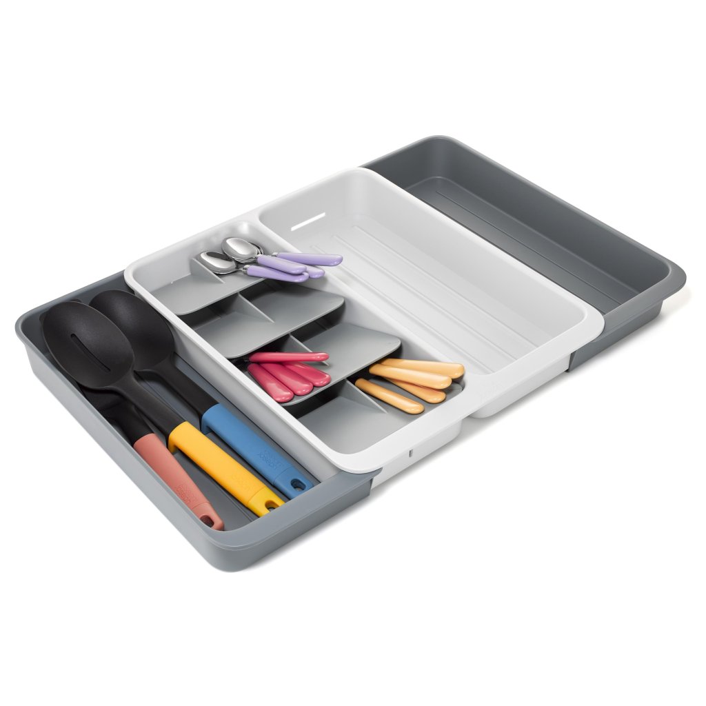 - Organizatorul de sertar Joseph Joseph DRAWERSTORE ajută la organizarea clară a tacâmurilor și ustensile de bucătărie în sertarul mobilierului de bucătărie.