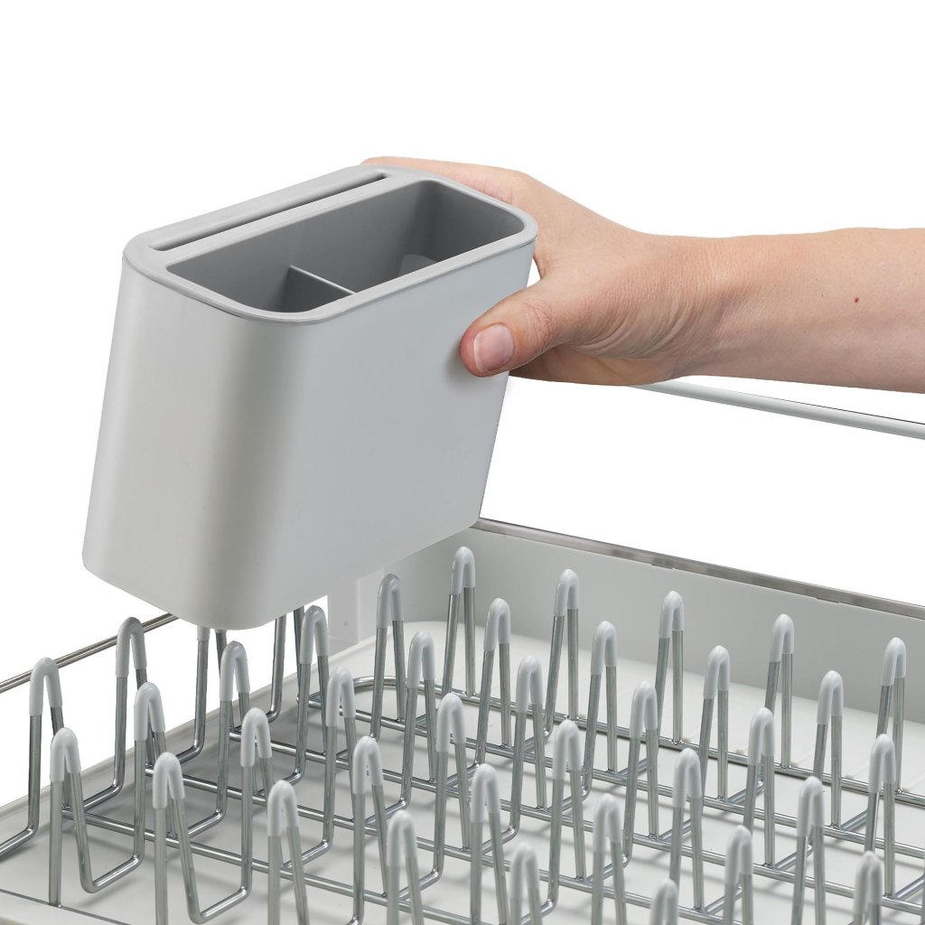 - Suportul detașabil separat scurgător de tacâmuri poate fi mutat după cum este necesar și include, de asemenea, un slot pentru depozitarea în siguranță a cuțitelor.