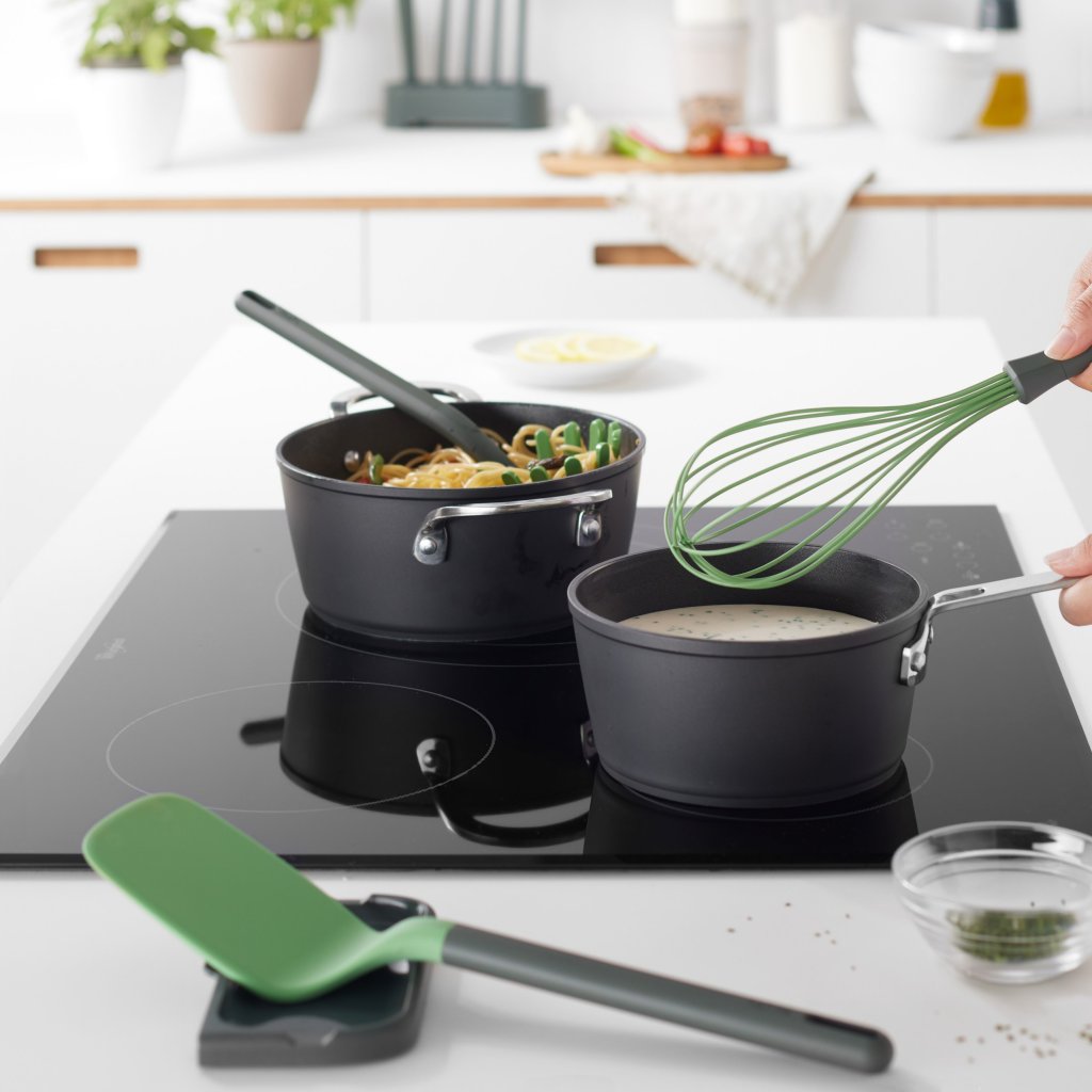 - mânerul din PBT (material rigid și igienic) poate rezista până la 180°C, astfel încât ustensila poate fi așezată pe o suprafață fierbinte, cum ar fi marginea vasului, în timp ce gătește